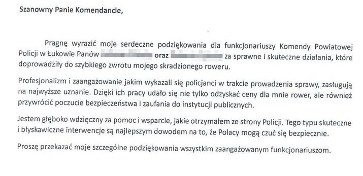 W liście skierowanym do Komendanta Powiatowego Policji w Łukowie 39-latek z Warszawy oprócz podziękowań stwierdził, że „dzięki ich pracy udało się nie tylko odzyskać cenny rower, ale również przywrócić poczucie bezpieczeństwa i zaufanie do instytucji publicznych … skuteczne i błyskawiczne interwencje są najlepszym dowodem na to, że Polacy mogą czuć się bezpiecznie.”