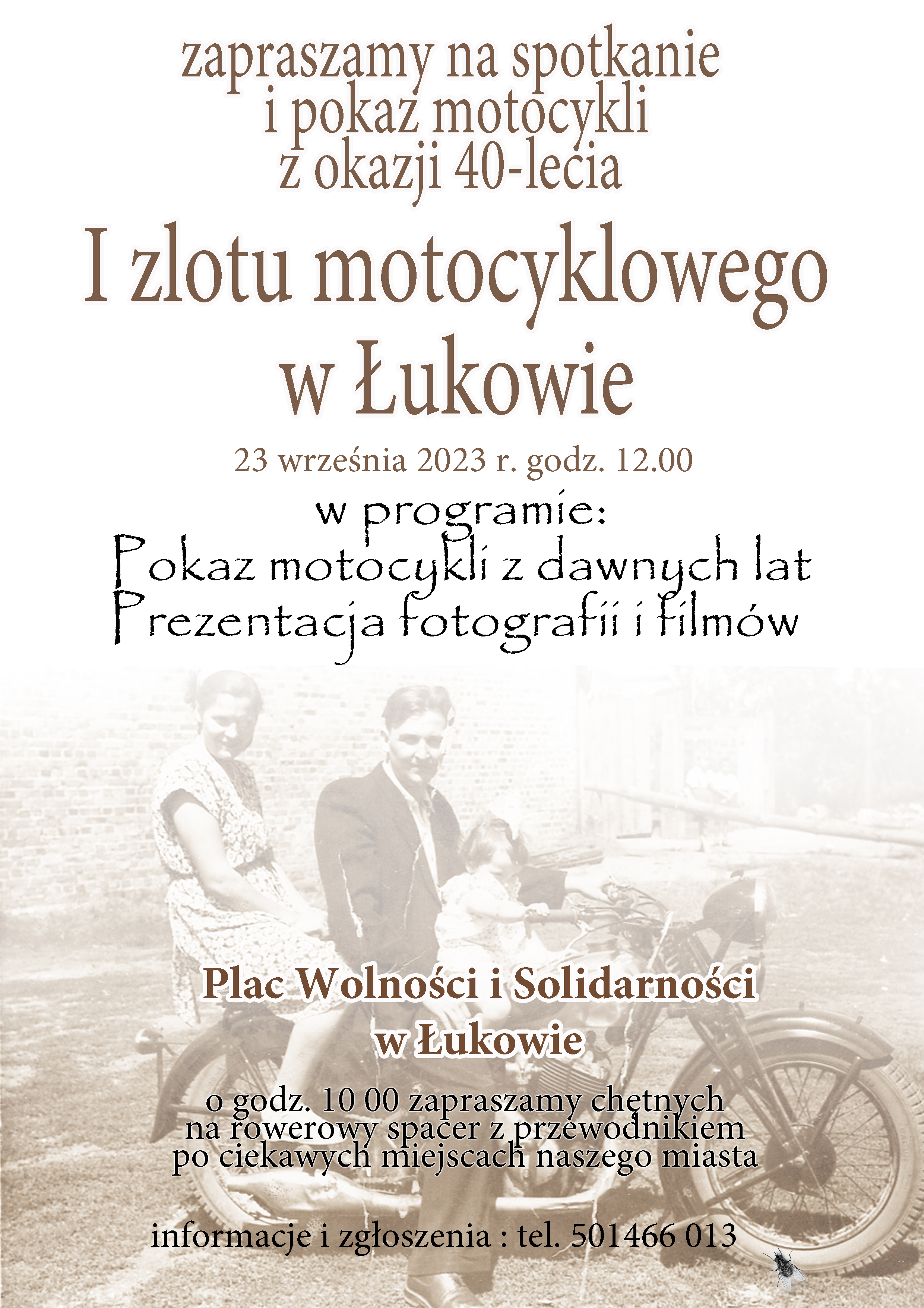 Pokaz starych motocykli odbędzie się w sobotę, 23 września na Placu Solidarności i Wolności w Łukowie. Podczas tego wydarzenia, które rozpocznie się o godzinie 12.00, zostaną wyświetlone stare filmy i zdjęcia. Zaplanowano też mini zawody w siłowaniu na rękę oraz otwieranie konserwy bez użycia otwieracza. Będzie również mini-kawiarenka z saturatorem oraz samowarem i wiele innych niespodzianek.Dwie godziny wcześniej, o godzinie 10.00, rozpocznie się rowerowy spacer z przewodnikiem po obrzeżach miasta. Zapisy i szczegółowe informacje są dostępne pod numerem telefonu 501 466 013.