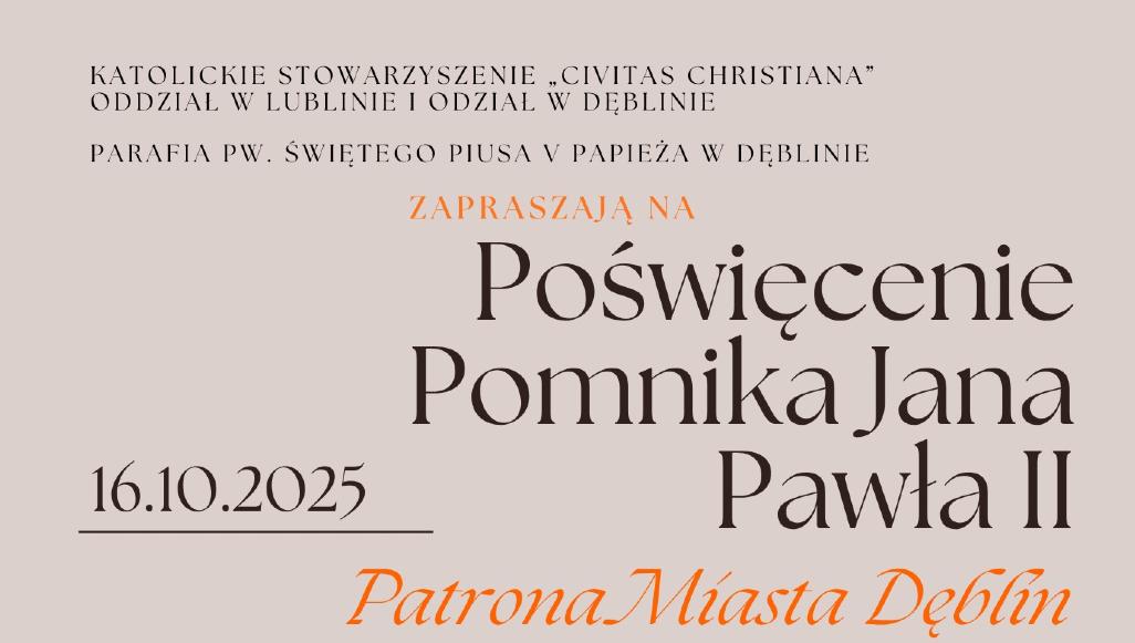 W rocznicę wyboru Karola Wojtyły na papieża mieszkańcy Dęblina oddadzą hołd św. Janowi Pawłowi II, uczestnicząc w uroczystości poświęcenia jego pomnika. Monument stanie w centralnym punkcie miasta – na placu przy ul. Niepodległości. W wydarzeniu, które odbędzie się w czwartek, 16 października, udział weźmie ordynariusz diecezji siedleckiej, biskup Kazimierz Gurda.
