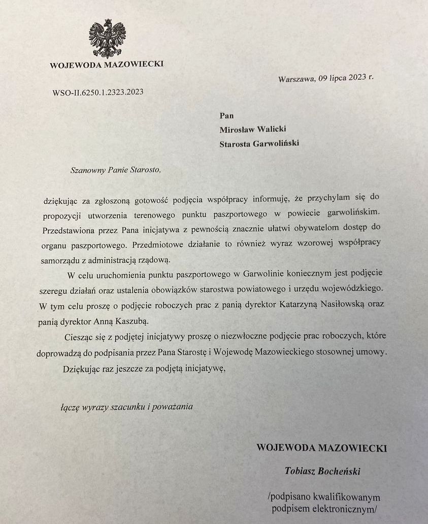 Wojewoda Mazowiecki Tobiasz Bocheński przychylił się do propozycji starosty garwolińskiego Mirosława Walickiego dotyczącej utworzenia punktu paszportowego w powiecie garwolińskim. - Już dziś podejmujemy szereg działań, by punkt paszportowy został uruchomiony jak najszybciej – deklaruje starosta.