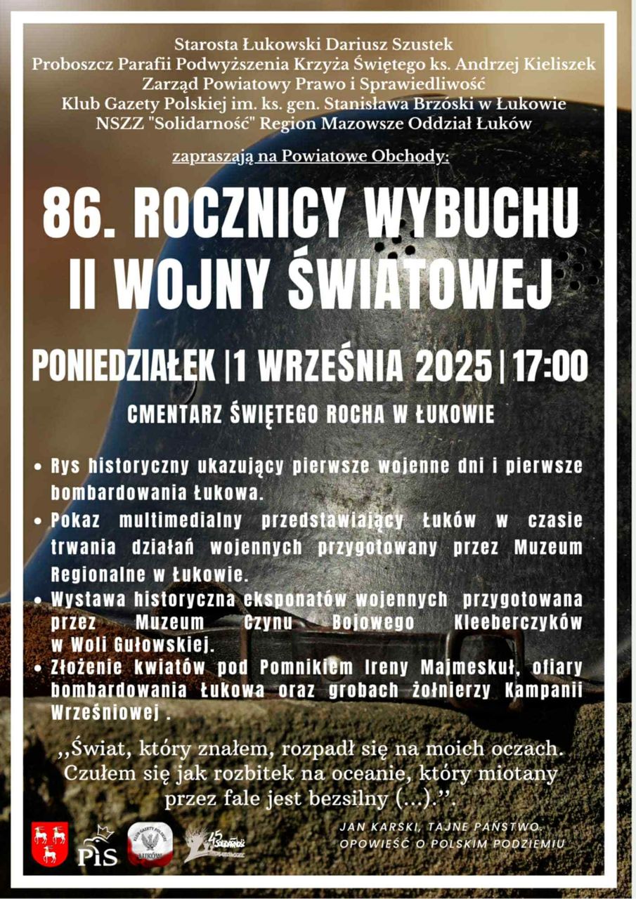 Powiatowe obchody organizują: Starostwo Powiatowe, parafia Podwyższenia Krzyża Świętego, Zarząd Powiatowy PiS, Klub Gazety Polskiej oraz łukowski oddział NSZZ „Solidarność”. Rocznicowe spotkanie odbędzie się na cmentarzu parafialnym Świętego Rocha i rozpocznie się o godzinie 17.00.Podczas wydarzenia zaplanowano pokaz multimedialny dotyczący działań wojennych w Łukowie, przygotowany przez Muzeum Regionalne, oraz wystawę eksponatów wojennych, którą przygotuje Muzeum Czynu Bojowego Kleeberczyków w Woli Gułowskiej. Przewidziano również prelekcję na temat pierwszych dni wojny w Łukowie.