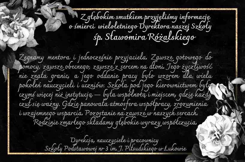 Śp. Sławomir Różalski, wieloletni nauczyciel i dyrektor Szkoły Podstawowej nr 3 i Gimnazjum nr 3 w Łukowie zmarł w wieku 66 lat. Jak informuje nas jego córka, pogrzeb odbędzie się w sobotę 16 sierpnia w parafii św. Jana Chrzciciela w Janowie Lubelskim. Msza Święta pogrzebowa rozpocznie się o godzinie 9.00. „Jeśli ktoś chciałby z nami pożegnać tatę, to serdecznie zapraszamy” – pisze na naszym portalu pani Marta.Dyrektora łukowskiej „Trójki” żegna też cała szkolna społeczność, informując jednocześnie, że Msza Święta w intencji śp. Sławomira Różalskiego odbędzie się w niedzielę 31 sierpnia o godzinie 9.00 w parafii NMP Matki Kościoła. Zamówili ją dyrekcja, nauczyciele, pracownicy i cała szkolna społeczność.