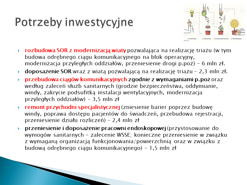Część inwestycji już się rozpoczęła. Trwa przeniesienie i doposażenie pracowni endoskopowej. Robert Lis chce także wyremontować laboratorium, szatnie, pozostałe oddziały, a także wydzielić strefę zakaźną na oddziale internistycznym. Wkrótce szpital zakupi dwie karetki transportowe. Jedną z nich dofinansują wszystkie samorządy powiatu radzyńskiego.