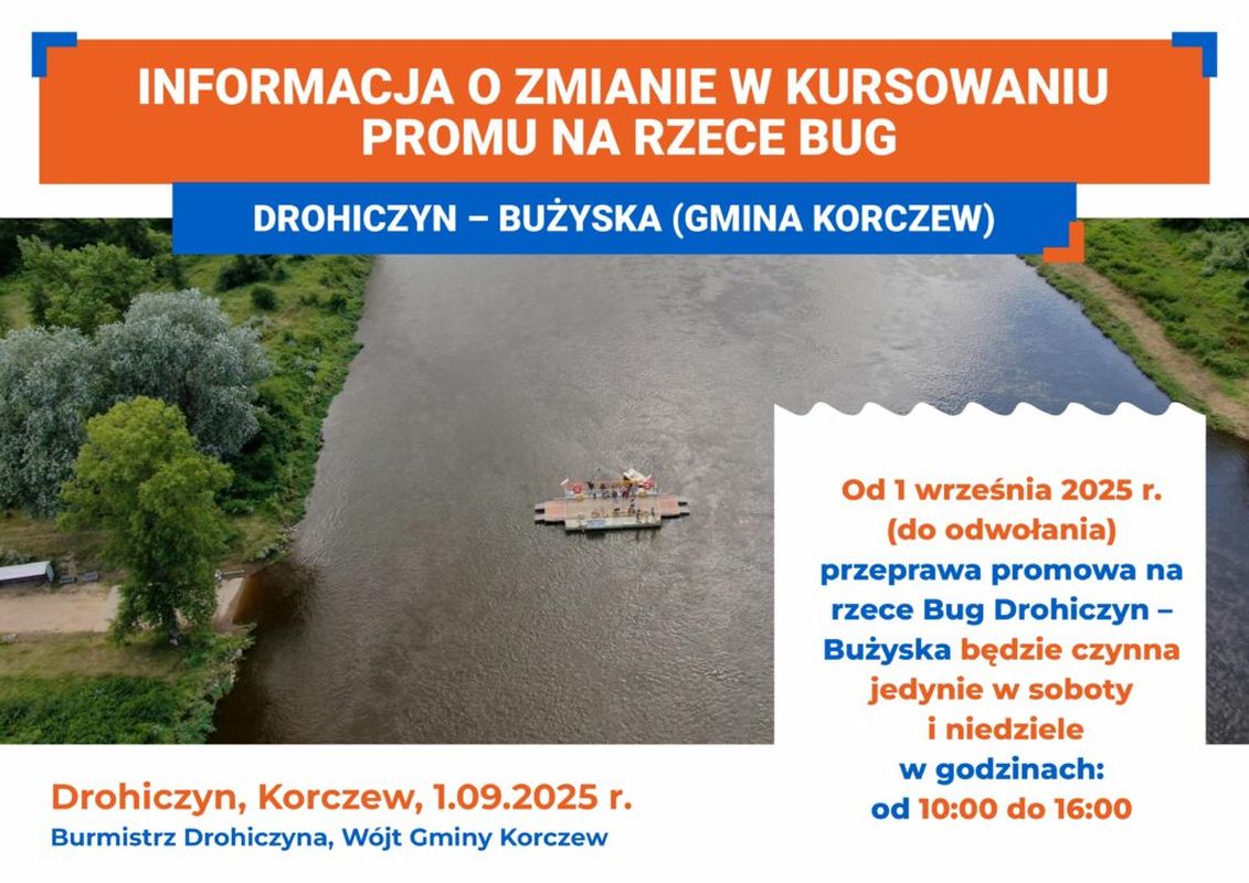 Przeprawa promowa na rzece Bug, łącząca Drohiczyn z gminą Korczew, nadal działa, ale we wrześniu zakres kursowania jest ograniczony.