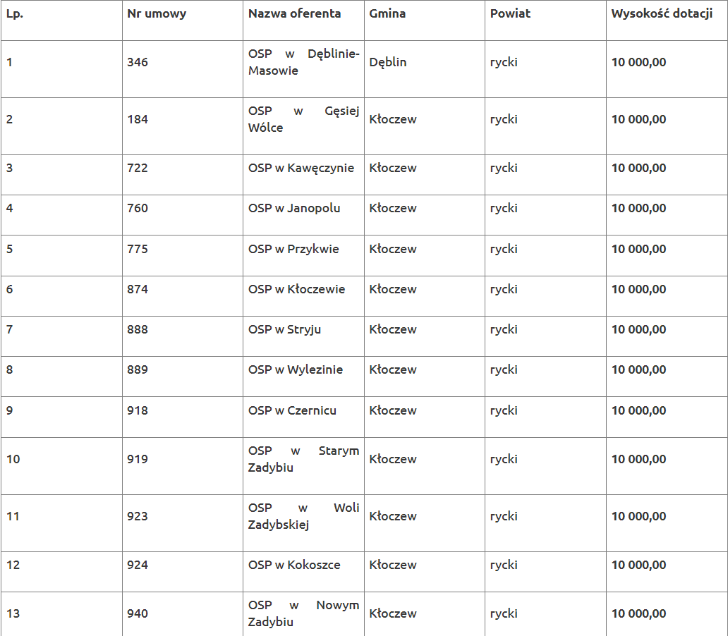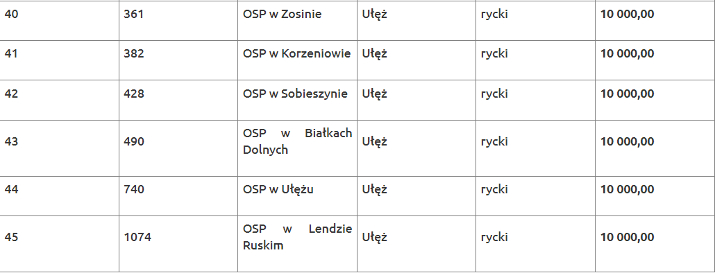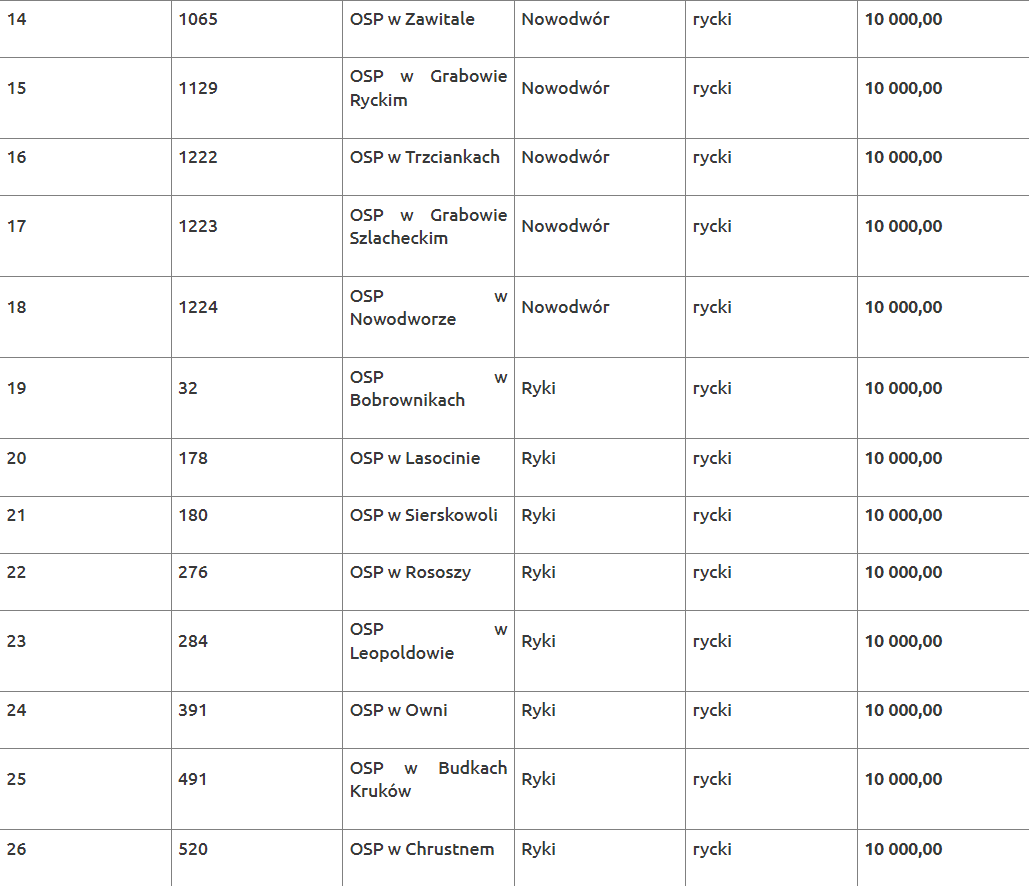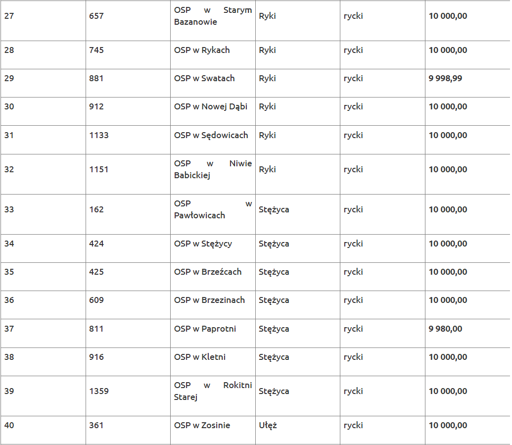 W Sali Konferencyjnej Starostwa Powiatowego w Rykach, we wtorek odbyło się uroczyste przekazanie przyznanych środków przez Marszałka Województwa Lubelskiego Jarosława Stawiarskiego. W Powiecie Ryckim dotację otrzymało 45 jednostek OSP, czyli wszystkie które ubiegały się o dofinansowanie. Środki pozyskane zostały w ramach otwartego konkursu ofert dla organizacji pozarządowych „Lubelskie wspiera OSP. Maksymalnie jeden zgłoszony podmiot mógł uzyskać do 10 000 tysięcy złotych.Dariusz Szczygielski, Starosta Rycki i jednocześnie Prezes Powiatowego Związku OSP pogratulował wszystkim OSP z terenu powiatu, które otrzymały dofinansowanie.