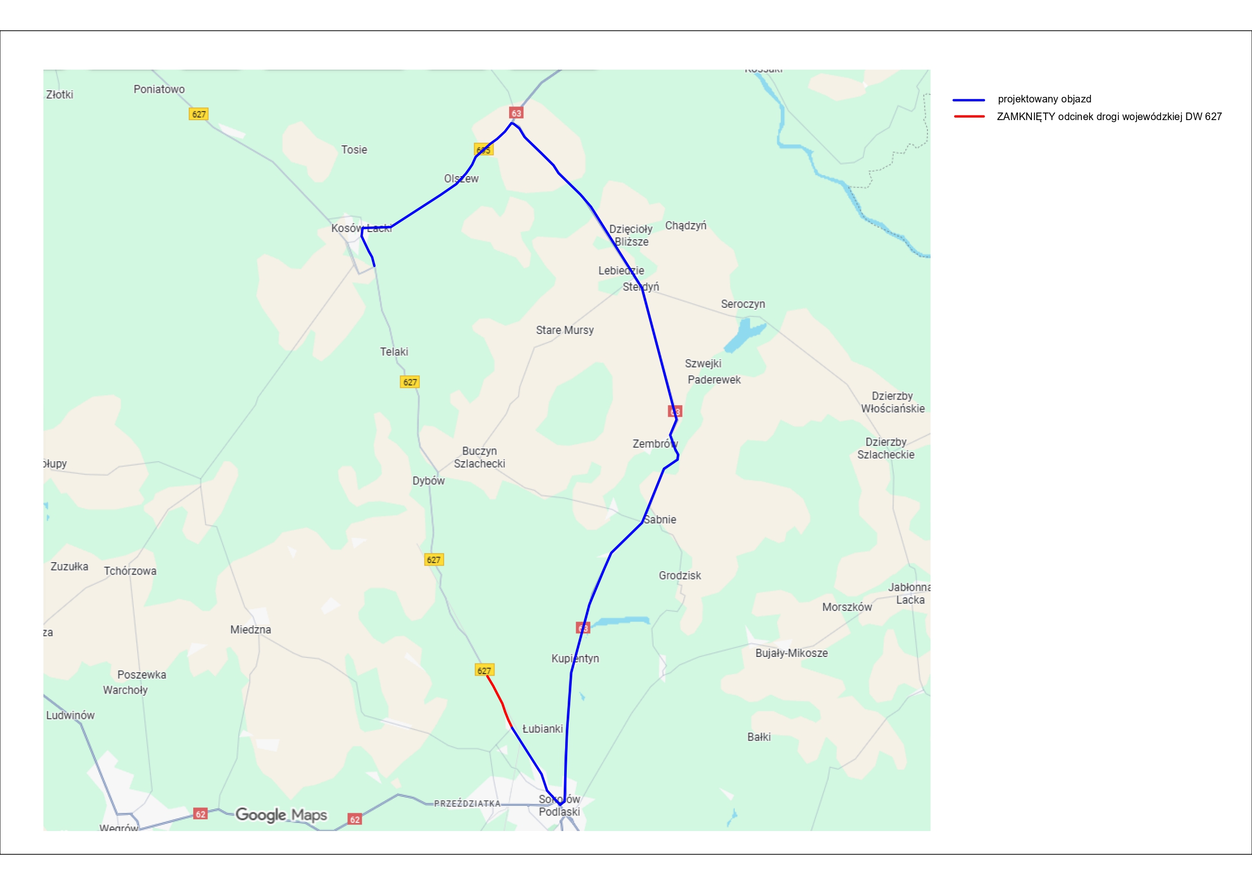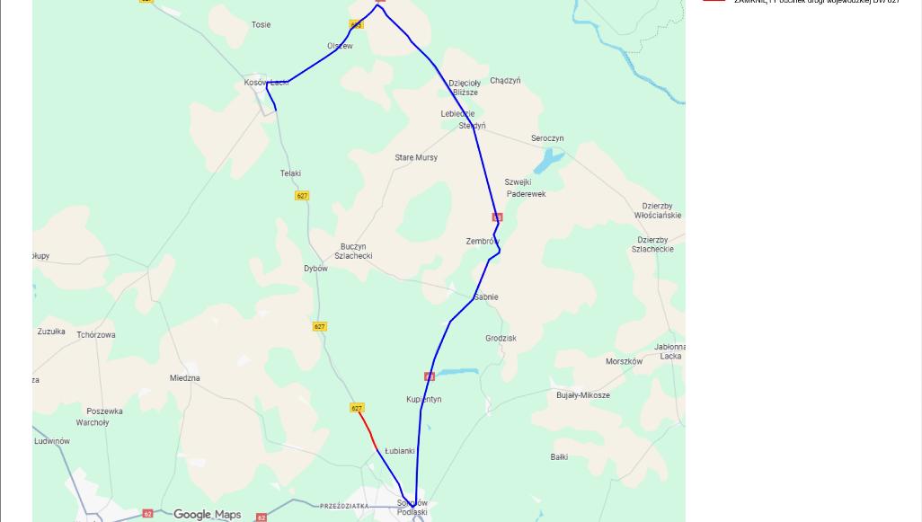 Od poniedziałku, 27 października, rozpoczną się prace związane z remontem drogi wojewódzkiej nr 627 na odcinku od km 91+737 do km 92+699. Roboty obejmą fragment trasy wyjazdowej z Sokołowa Podlaskiego w kierunku Kosowa Lackiego. Wyznaczono objazd przez Zembrów i Sterdyń. Zamknięcie drogi może potrwać do końca listopada.