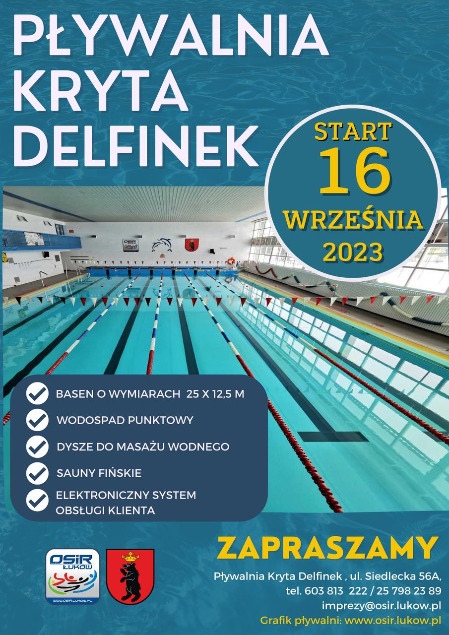 Po letniej przerwie, kiedy to otarta była pływalnia „Delfin”, mieszkańcy Łukowa i okolic będą mogli ponownie korzystać z krytej pływalni „Delfinek”. Zostanie ona otwarta już w najbliższą sobotę 16 września. Będzie czynna każdego dnia, przez dziesięć najbliższych miesięcy. Grafik wejść na basen oraz cennik są dostępne na stronie Ośrodka Sportu i Rekreacji. Tam również informacja o podsumowaniu letniego sezonu, podczas którego z pływalni „Delfin” skorzystało dokładnie 48 587 osób.Sezon na krytej pływalni „Delfinek” rusza już w sobotę 16 września.