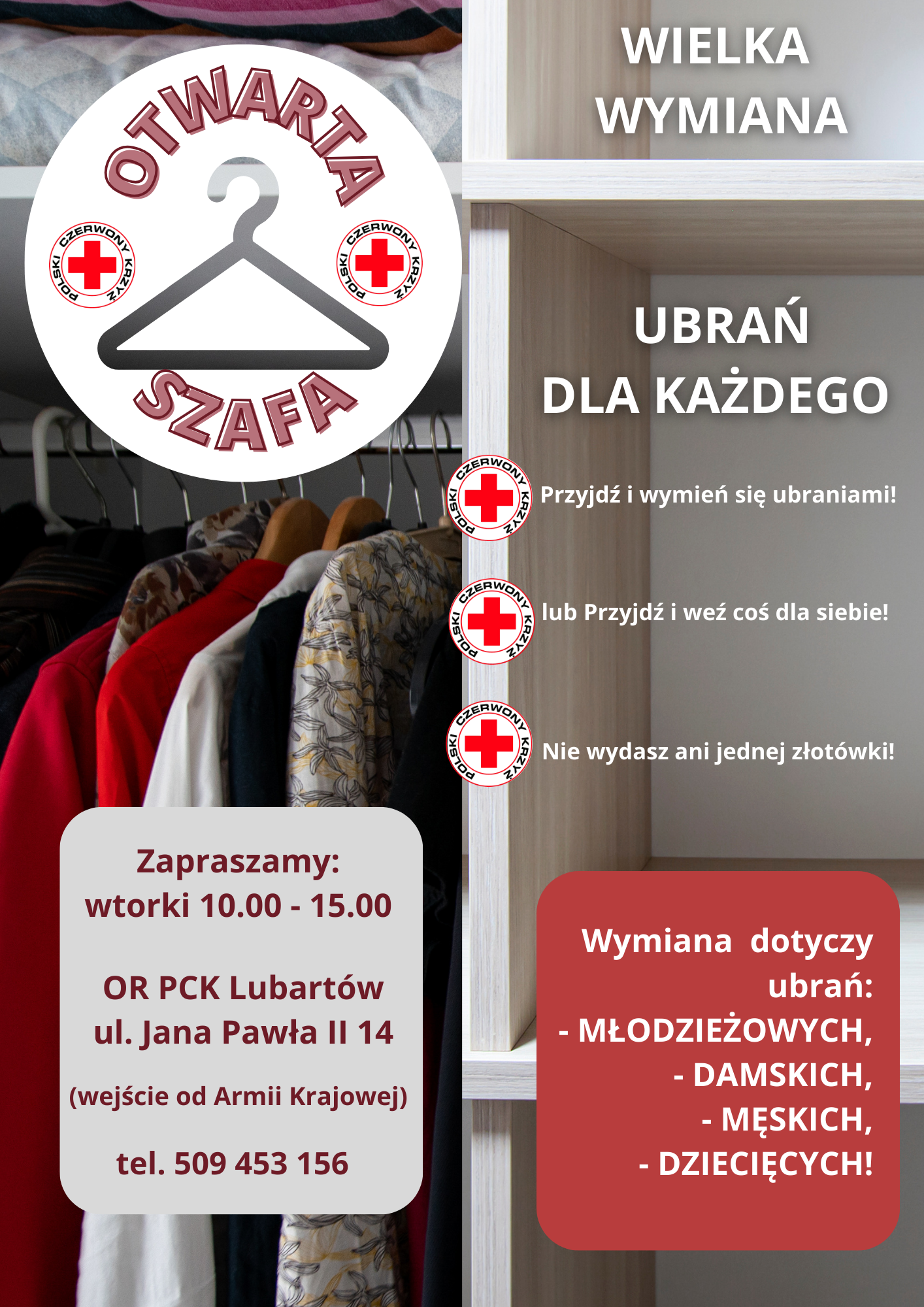 Wymiana dotyczy odzieży oraz obuwia dziecięcego, młodzieżowego, damskiego oraz męskiego. Ważne jest, aby przynoszone ubrania nie były zniszczone. Można je dostarczać do siedziby PCK w Lubartowie na ul. Jana Pawła II 14, w każdy wtorek w godzinach 10:00 -15:00.Oddział Rejonowy Polskiego Czerwonego Krzyża w Lubartowie już dziś zaprasza na wielką wymianę ubrań dla każdego, dzięki której masz szansę uporządkować rzeczy w swojej garderobie, a jednocześnie znaleźć coś nowego, oddać coś co przyda się innym. Akcja wpisuje się w zasady Zero Waste, czyli w ochronę wszystkich zasobów poprzez odpowiedzialną produkcję, konsumpcję i ponowne wykorzystanie produktów.