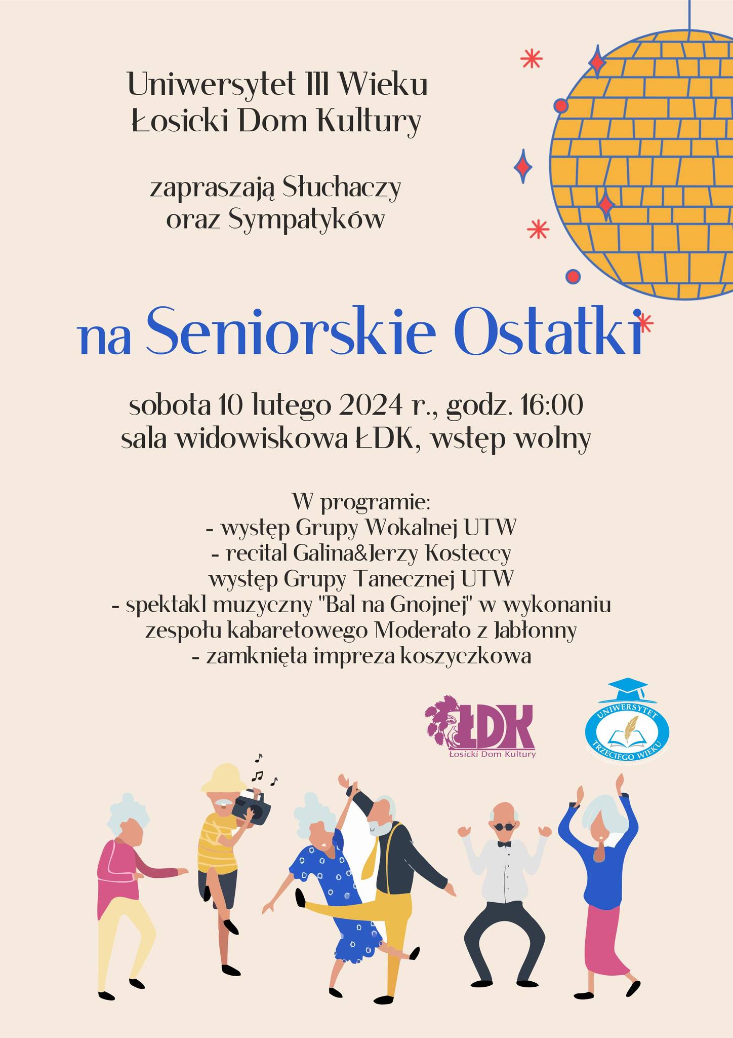 W sobotę, 10 lutego w sali widowiskowej Łosickiego Ośrodka Kultury odbędą się Seniorskie Ostatki. W programie występy muzyczne, taneczne, kabaretowe oraz zabawa koszyczkowa. Wydarzenie rozpocznie się o godzinie 16:00. Wstęp wolny.