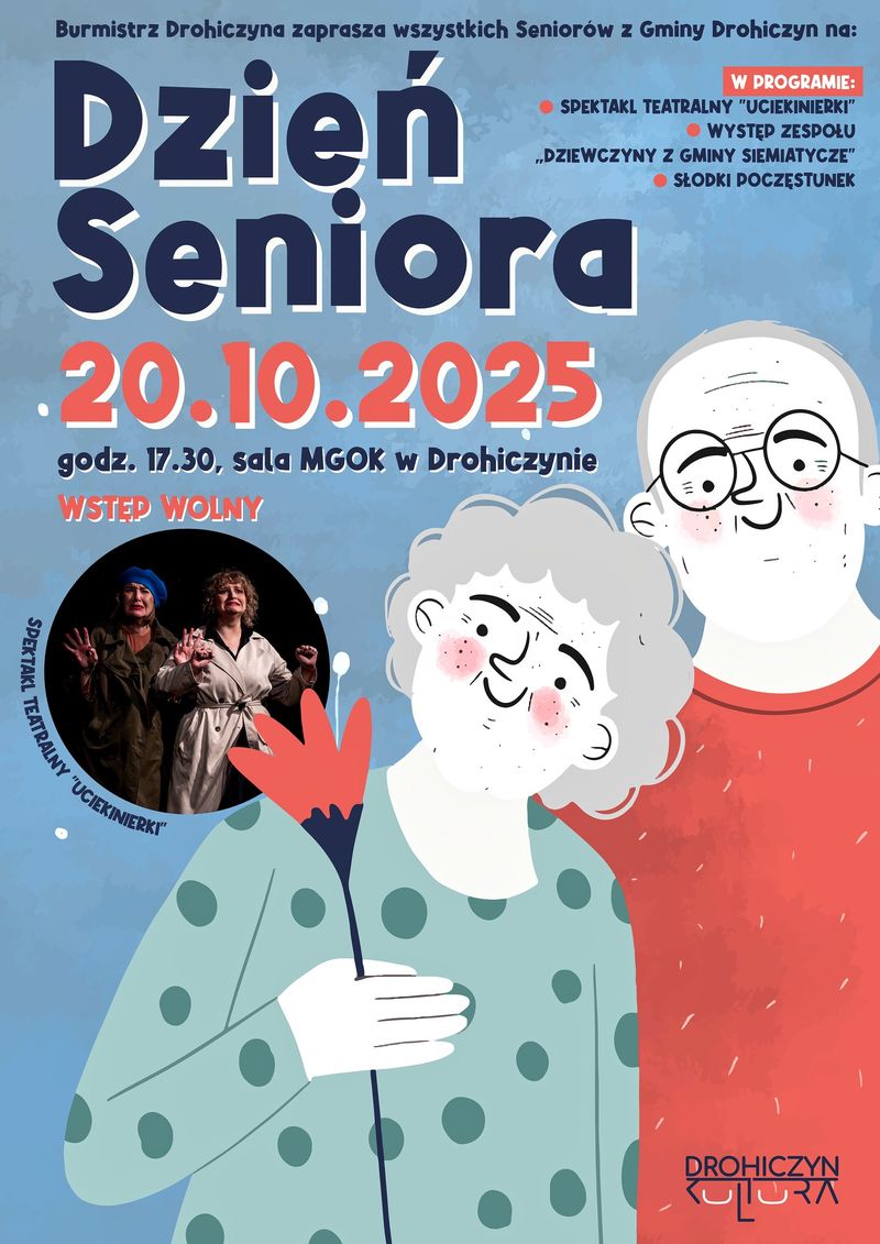 Poniedziałkowe popołudnie wypełnią muzyka i zabawa. W programie: spektakl teatralny „Uciekinierki”, występ zespołu „Dziewczyny z Gminy Siemiatycze” i słodki poczęstunek. Początek spotkania godz. 17.30 w sali MGOK w Drohiczynie. Wstęp wolny.Seniorzy swoje święto obchodzą jesienią, chociaż ma ono różne nazwy i różne daty. 1 października przypada Międzynarodowy Dzień Osób Starszych, 20 października - Europejski Dzień Seniora, zaś 14 listopada - Ogólnopolski Dzień Seniora. Niezależnie od daty i nazwy ważne, aby docenić i uhonorować osoby starsze. Formą takiego podziękowania będzie drohiczyński Dzień Seniora.
