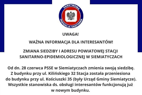 Powiatowa Stacja Sanitarno Epidemiologiczna w Siemiatyczach od 29 czerwca zmienia swoją siedzibę.