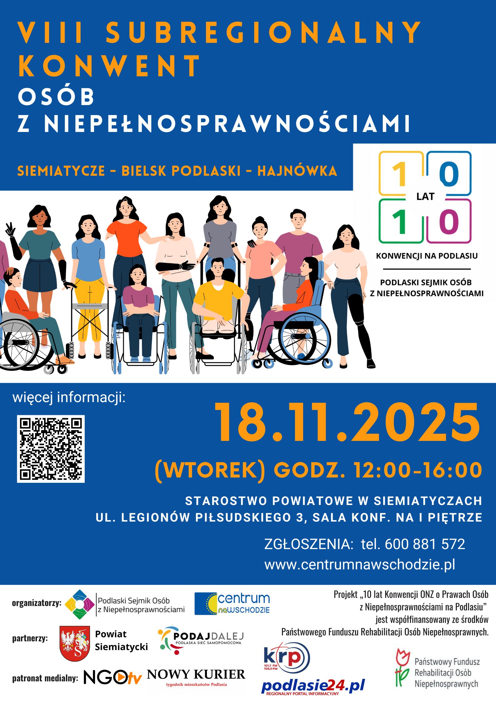 18 listopada w Siemiatyczach odbędzie się ważne spotkanie środowiska osób z niepełnosprawnościami. W Starostwie Powiatowym przy ul. Legionów Piłsudskiego 3 (duża sala konferencyjna, I piętro) w godzinach 12:00–16:00 zaplanowano VIII Subregionalny Konwent Osób z Niepełnosprawnościami (Siemiatycze – Bielsk Podlaski – Hajnówka).