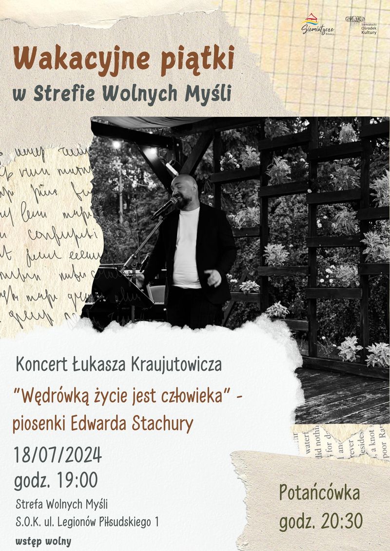 W Strefie Wolnych Myśli przy Siemiatyckim Ośrodku Kultury, w ramach cyklu „Wakacyjne piątki”, wystąpi Łukasz Kraujutowicz. Muzyk zaprezentuje utwory z repertuaru Edwarda Stachury. Koncert odbędzie się w piątek, 18 lipca, o godz. 19:00 przy SOK-u, ul. Legionów Piłsudskiego 1.