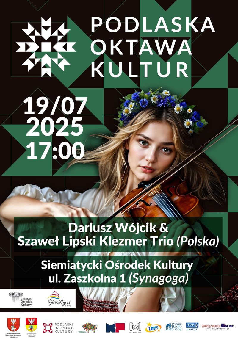 W Siemiatyczach zagości również Podlaska Oktawa Kultur 2025. W sobotę, 19 lipca, o godz. 17:00 w Siemiatyckim Ośrodku Kultury przy ul. Zaszkolnej 1 wystąpi Dariusz Wójcik & Szaweł Lipski Klezmer Trio. Wstęp wolny.