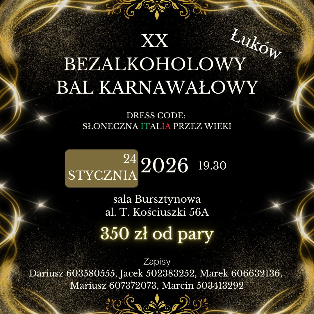 XX Bezalkoholowy Bal Karnawałowy w Łukowie odbędzie się 24 stycznia w Sali Bankietowej Bursztynowa. Rozpocznie się o godzinie 19:30. Uczestnicy zabawy proszeni są o kreatywne podejście do tematu, który w tym roku brzmi: „Słoneczna Italia przez wieki”. Mile wdziane będą stroje nawiązujące do różnych epok od starożytności, poprzez średniowiecze, do czasów współczesnych.Zapisy na bal przyjmowane są pod kilkoma numerami telefonów: