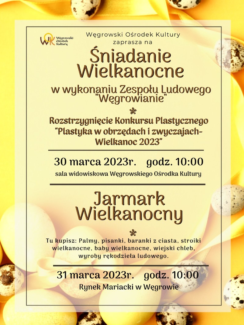 30 marca w sali widowiskowej Węgrowskiego Ośrodka Kultury odbędzie się Śniadanie Wielkanocne w wykonaniu Zespołu Ludowego Węgrowianie.
