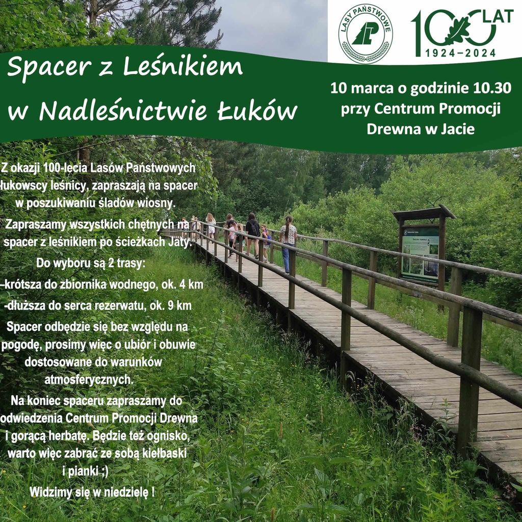 W tym roku obchodzimy 100-lecie powstania Lasów Państwowych. Z tej okazji czeka nas zapewne wiele równych wydarzeń. Jedno z nich odbędzie się już w najbliższą niedzielę, 10 marca w Nadleśnictwie Łuków. Tego dnia odbędzie się „Spacer z Leśnikiem”. Rozpocznie się on o godzinie 10.30 przy Centrum Promocji Drewna. Do wyboru będą dwie trasy: 4- i 9-kilometrowa. Niedzielny spacer w poszukiwaniu pierwszych oznak wiosny w Rezerwacie Jata zakończy ognisko.Szczegóły na plakacie.
