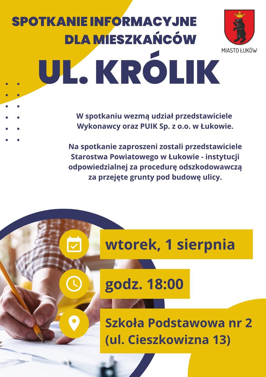 Spotkanie dla mieszkańców ulicy Królik organizuje burmistrz Piotr Płudowski. Obecni na nim mają być przedstawiciele firmy, która będzie prowadziła prace, przedstawiciele miejskiej spółki PUIK oraz przedstawiciele Starostwa Powiatowego, które jest odpowiedzialne za prowadzenie procedury odszkodowawczej za przejęte pod budowę ulicy grunty. Spotkanie to odbędzie się we wtorek 1 sierpnia o godzinie 18.00 w budynku Szkoły Podstawowej nr 2 w Łukowie. Mieszkańcy zapoznają się z harmonogramem prac oraz usłyszą o utrudnieniach, jakie na pewno będą występować podczas budowy drogi.Budową ulicy Królik zajmie się Przedsiębiorstwo Robót Inżynieryjno - Drogowych z Łukowa. W ramach inwestycji ma zostać wykonana m.in. rozbiórka istniejącej i budowa nowej sieci gazowej oraz budowa sieci wodociągowej, teletechnicznej i energetycznej. Wykonawca prac przeprowadzi też roboty rozbiórkowe i ziemne związane z ułożeniem nowej nawierzchni. Koszt inwestycji to 10 mln 200 tys. zł. Połowa tej kwoty, czyli około 5,5 mln zł to dofinansowanie ze środków Rządowego Funduszu Rozwoju Dróg. Inwestycja ma się zakończyć w drugiej połowie przyszłego roku.