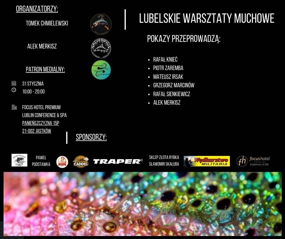 W sobotę, 31 stycznia, w godzinach 10:00–20”00, w Focus Hotel Premium w Lublinie odbędą się Lubelskie Warsztaty Muchowe. Wydarzenie skierowane jest zarówno do doświadczonych wędkarzy, jak i osób, które dopiero rozpoczynają swoją przygodę z wędkarstwem muchowym. Podczas warsztatów uczestnicy będą mieli okazję dowiedzieć się, jak tworzyć muszki oraz jak skutecznie wykorzystać je w praktyce nad wodą.Organizatorami wydarzenia są Tomasz Chmielewski oraz Aleksander Merkisz, którzy zaprosili do Lublina uznanych krętaczy much – w tym zawodników i mistrzów Polski w wędkarstwie muchowym. Podczas pokazów każdy uczestnik będzie mógł podszkolić swoje umiejętności, podpatrzeć sprawdzone wzory, wymienić doświadczenia oraz skorzystać z indywidualnych porad ekspertów.