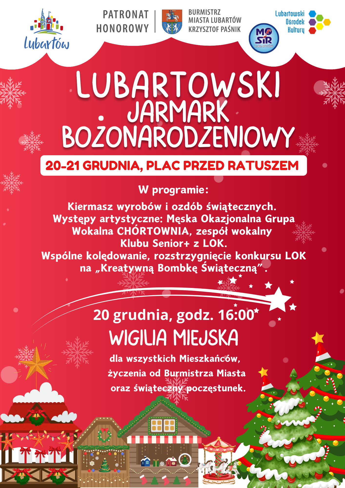 Burmistrz Miasta Lubartów Krzysztof Paśnik zaprasza wszystkich mieszkańców na Lubartowski Jarmark Bożonarodzeniowy oraz przedświąteczne spotkanie. - Czeka nas sporo atrakcji. Na stoiskach będą m.in. ozdoby świąteczne, bombki, stroiki, wyroby ze słomy, a także regionalne przysmaki – miody, sery, pierniki, chleby, wędliny. Znajdziecie również oryginalne i niepowtarzalne prezenty świąteczne - informują organizatorzy.Jarmark odbędzie się w godz. 10:00 -18:00. Z myślą o najmłodszych przybędzie Mikołaj. Na świątecznej scenie wystąpią lokalni artyści, w tym Męska Okazjonalna Grupa Wokalna CHÓRTOWNIA oraz zespół wokalny Klubu Senior+. Podczas jarmarku rozstrzygnięty zostanie konkurs plastyczny na „Kreatywna Bombkę Świąteczną” organizowany dla uczniów szkół przez Lubartowski Ośrodek Kultury. Wigilijny poczęstunek oraz życzenia od Burmistrza Miasta Krzysztofa Paśnika rozpoczną się w środę 20 grudnia o godz. 16:00.