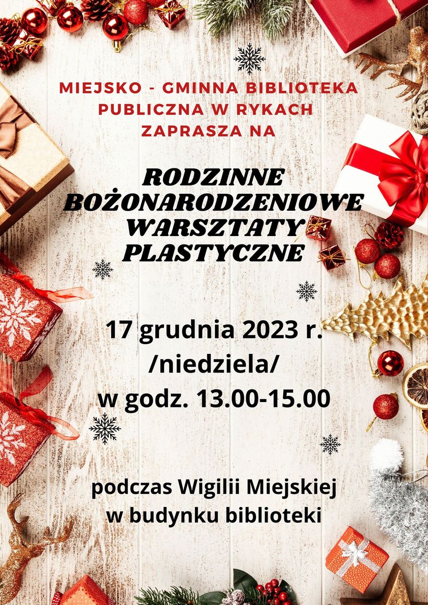 Dla uczestników przygotowano również wspólne kolędowanie. Na koniec świątecznego jarmarku swój koncert będzie miała Orkiestra Dęta OSP Ryki. W budynku Miejsko-Gminnej Biblioteki publicznej odbędą się warsztaty plastyczne dla całych rodzin.Więcej informacji na plakatach.