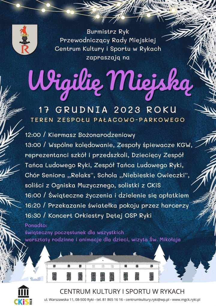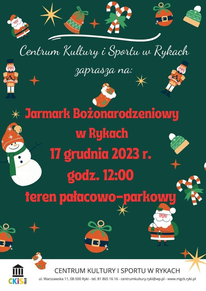 Kiermasz Bożonarodzeniowy, występy zespołów muzycznych, animacje dla dzieci, a na koniec wizyta świętego Mikołaja - wszystkie te atrakcje czekają na uczestników spotkania przedświątecznego, które odbędzie się w niedzielę, 17 grudnia w Rykach na terenie zespołu pałacowo-parkowego.