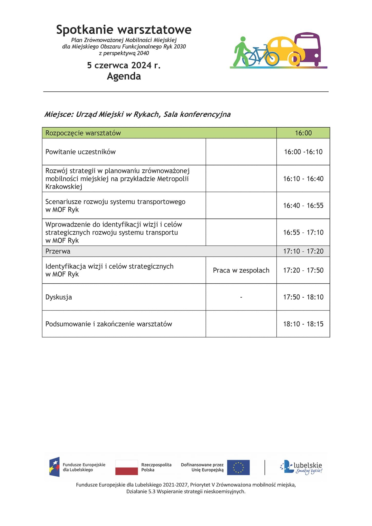 W środę, 5 czerwca o godzinie 16:00 w sali konferencyjnej w Urzędzie Miejskim w Rykach odbędzie się spotkanie warsztatowe poświęcone Planowi Zrównoważonej Mobilności Miejskiej dla Miejskiego Obszaru Funkcjonalnego Ryk. Plan ma za zadanie określić wizję i cele rozwoju w zakresie systemu transportowego i mobilności, przy wzięciu pod uwagę opinii społeczności lokalnej.