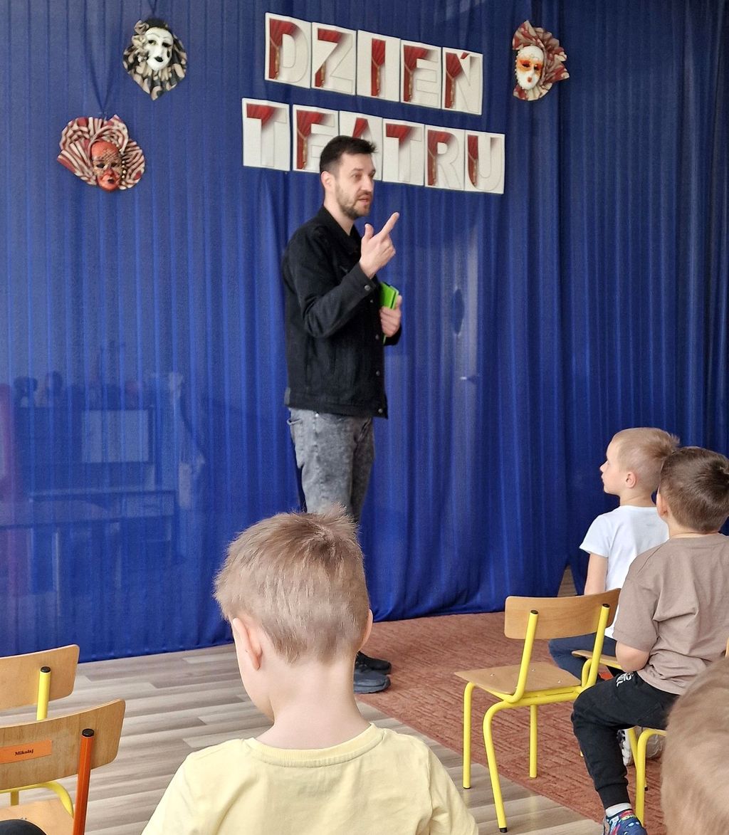 Dzieci z grup Motylki, Biedroneczki, Kropelki i Słoneczka z Przedszkola Miejskiego nr 4 Fantazja w Łukowie miały okazję spotkać się z Robertem Protasewiczem, aktorem siedleckiego Teatru ES. Przedszkolaki mogły poznać tajniki pracy aktorskiej i zadawać gościowi pytania.