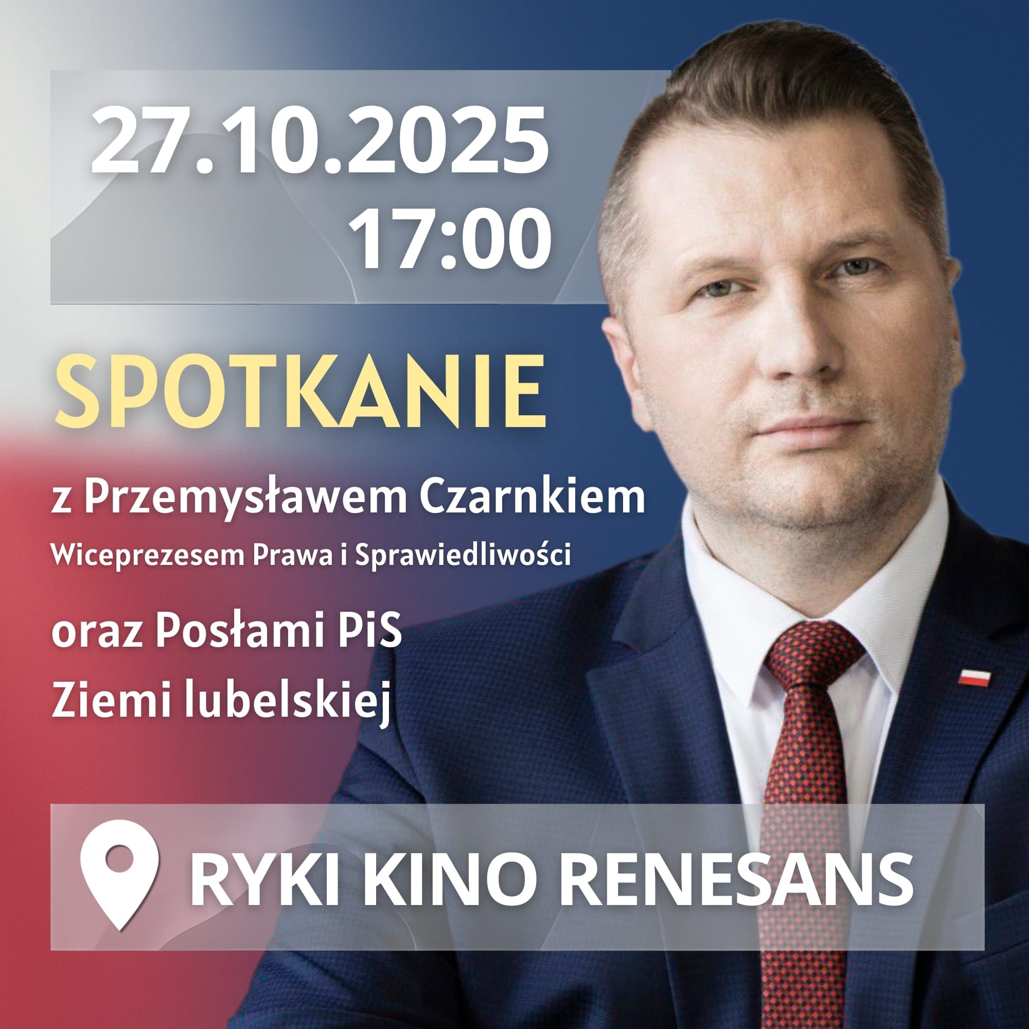 W kinie „Renesans” w Rykach odbędzie się spotkanie z Przemysławem Czarnkiem, wiceprezesem Prawa i Sprawiedliwości, oraz innymi posłami PiS z ziemi lubelskiej. Wydarzenie zaplanowano na poniedziałek, 27 października, o godzinie 17:00. Spotkanie będzie miało charakter otwarty i mogą w nim wziąć udział wszyscy zainteresowani mieszkańcy.