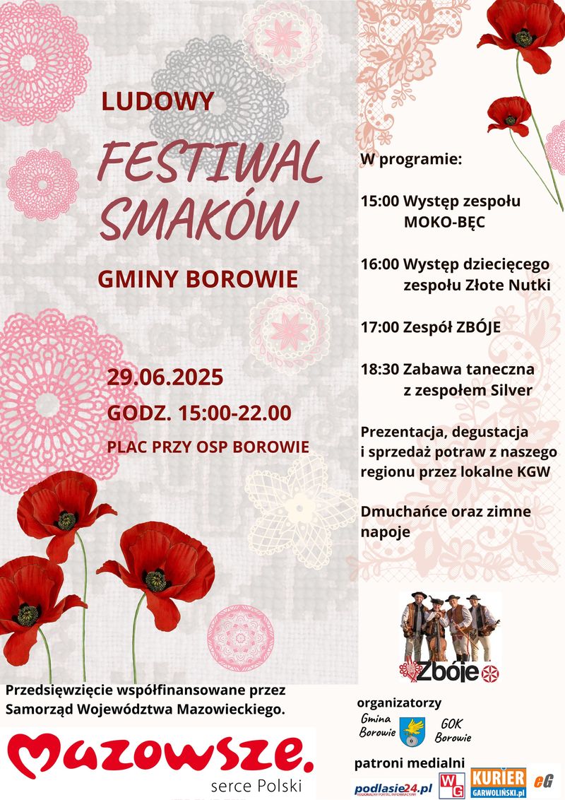 W niedzielę, 29 czerwca, o godzinie 15:00, po raz drugi w Borowiu odbędzie się Ludowy Festiwal Smaków Gminy Borowie. - O kulinarną i regionalną oprawę imprezy zadba aż 11 kół gospodyń wiejskich z terenu gminy. Są to KGW z Chromina, Filipówki, Głoskowa, Iwowego, Wilchty, Borowia, Łętowa, Jaźwin, Łopacianki, Nowej Brzuzy i Słupa Drugiego. Każde KGW przygotuje jedną potrawę regionalną, którą wykonywały nasze babcie, a teraz zupełnie ich już nie znamy, a następnie odbędzie się prezentacja potraw – mówi Katarzyna Iwaniec, dyrektor GOK i dodaje, że przy każdej takiej prezentacji przewodnicząca koła opowie, jak została przygotowana potrawa oraz z jakich produktów. Będzie możliwość degustacji tych smakołyków.Na estradzie wystąpi znany w okolicy zespół Moko–Bęc, dziecięcy zespół Złote Nutki, ''Zbóje'', a na zakończenie zabawa taneczna z zespołem Silver.