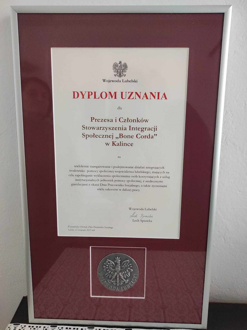 W minioną środę, 22 listopada w Sali Błękitnej Lubelskiego Urzędu Wojewódzkiego z okazji wojewódzkich obchodów Dnia Pracownika Socjalnego odbyło się spotkanie pracowników pomocy społecznej województwa lubelskiego. Podczas uroczystej gali Stowarzyszenie Integracji Społecznej „Bone Corda” z Kalinki otrzymało Dyplom Uznania Wojewody Lubelskiego z Medalem.