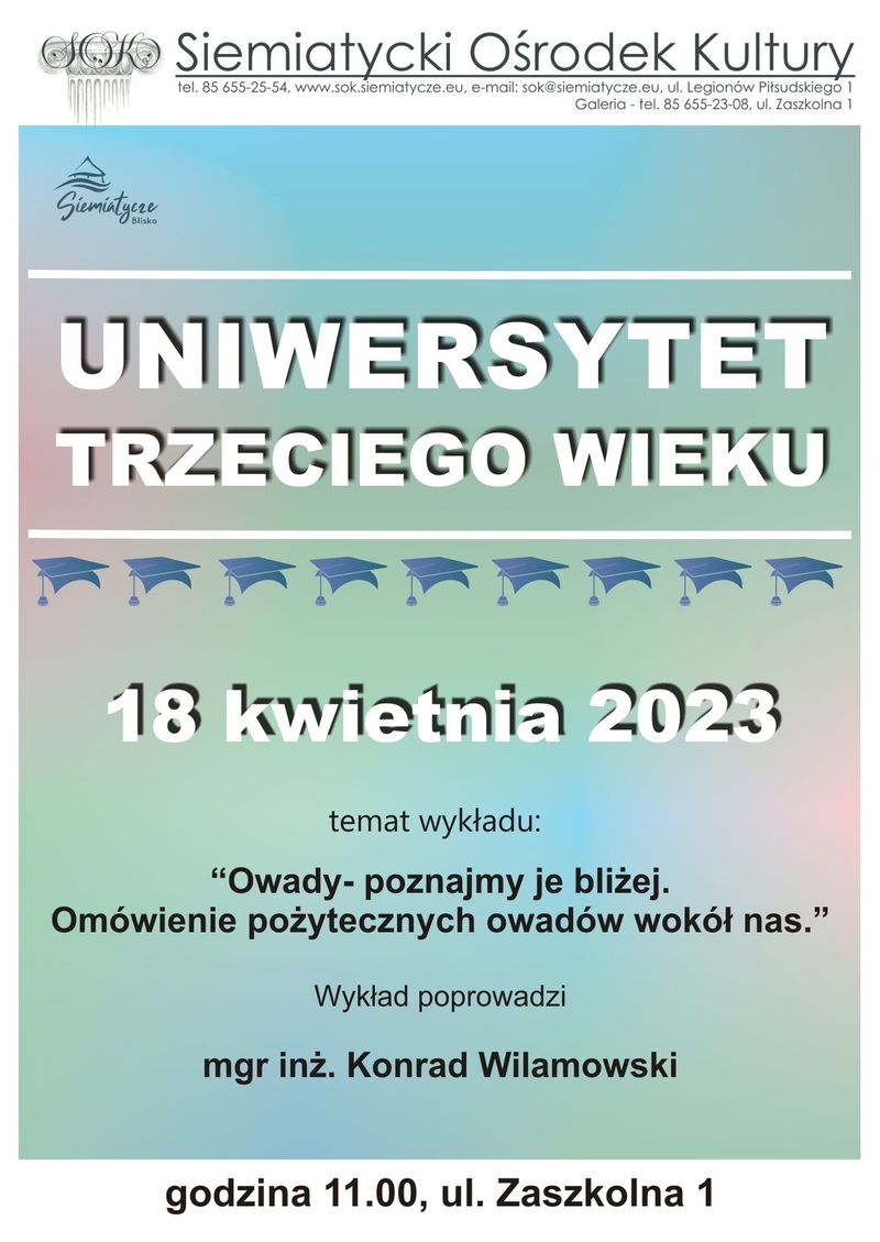 Tym razem tematem wykładu będą owady. Prelekcję „Owady – poznajmy je bliżej. Omówienie pożytecznych owadów wokół nas” przedstawi mgr inż. Konrad Wilamowski z Wydziału Budownictwa i Nauk o Środowisku Politechniki Białostockiej.Spotkanie rozpocznie się o godz. 11.00 w Siemiatyckim Ośrodku Kultury przy ul. Zaszkolnej 1.