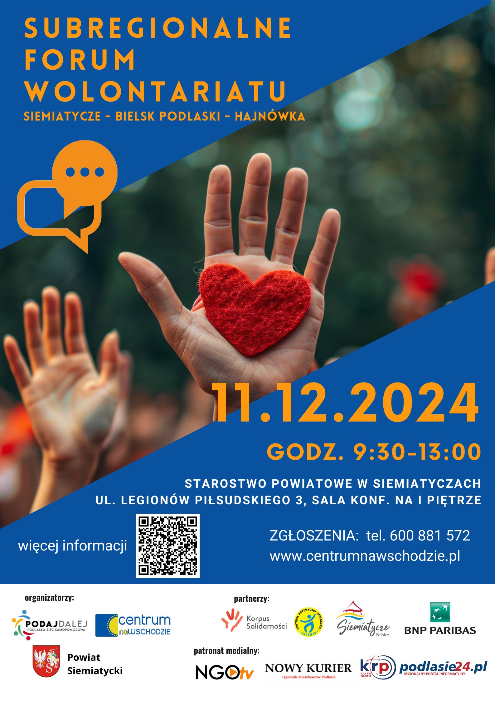 Forum adresowane jest do organizacji społecznych, szkolnych kół wolontariatu, centrów wolontariatu, nieformalnych grup pomocowych, instytucji, społeczników i wolontariuszy oraz każdego, kto chce dowiedzieć się jak pomagać mądrze i skutecznie.Forum odbędzie się w Starostwie Powiatowe w Siemiatyczach, ul. Legionów Piłsudskiego 3, w sali konferencyjnej na I piętrze.