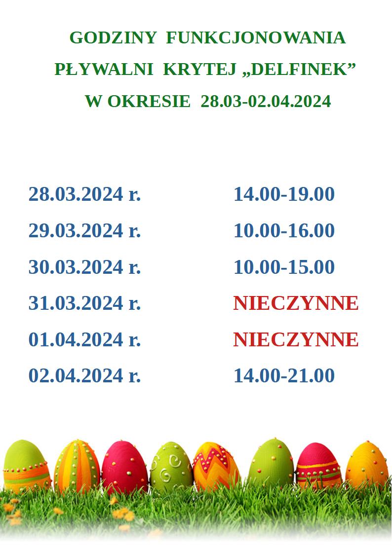 Przed nami Święta Wielkiej Nocy. W tym czasie zmienią się godziny otwarcia łukowskiej krytej pływalni „Delfinek”. Od czwartku, 28 marca basen będzie czynny przez kilka godzin, a w Wielką Niedzielę i w Wielki Poniedziałek będzie zamknięty.