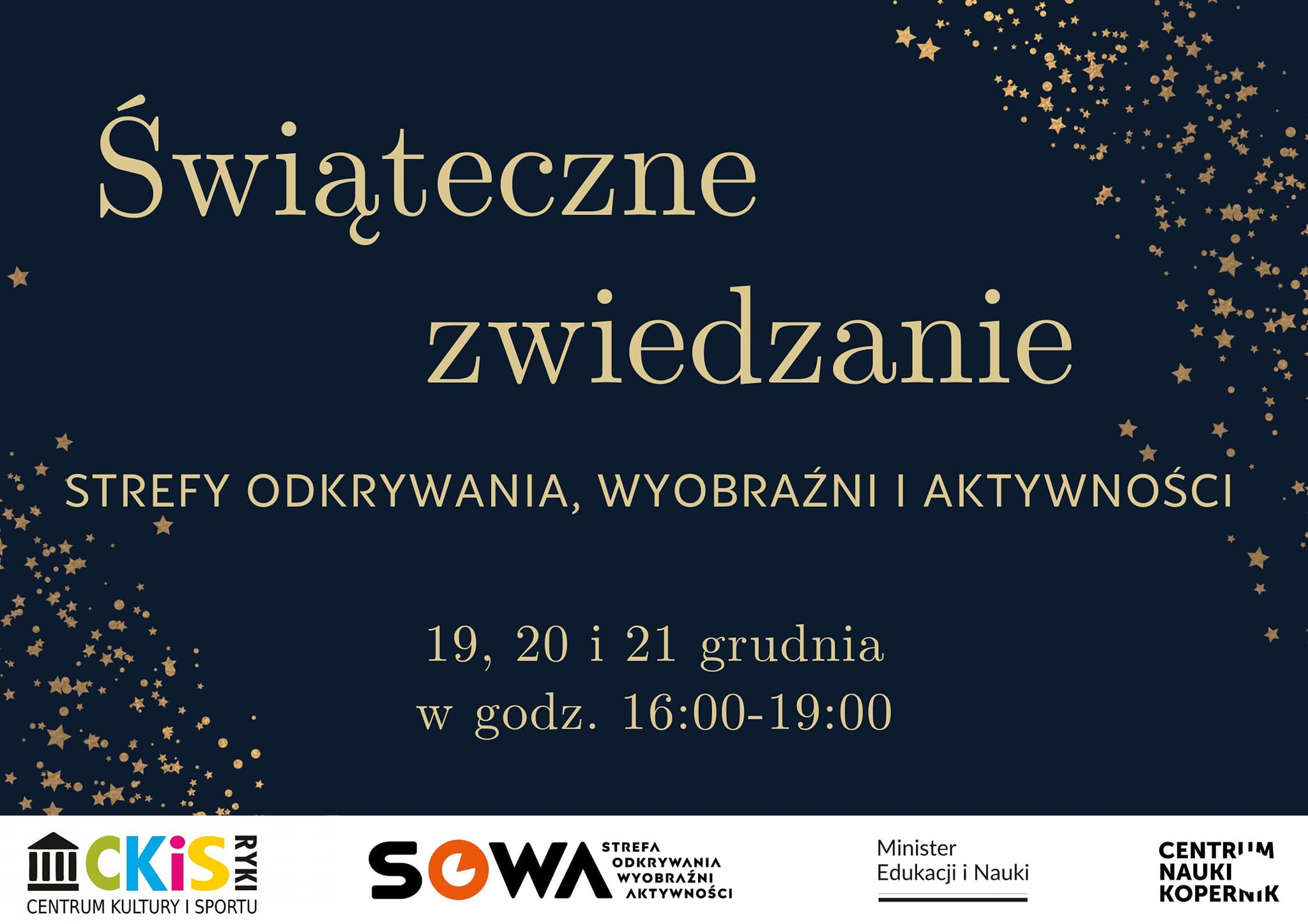 Inicjatywa „SOWA - Strefa Odkrywania, Wyobraźni i Aktywności” finansowana jest w ramach dotacji Ministra Edukacji i Nauki, na podstawie umowy z dnia 2 marca 2021 r. w sprawie uruchomienia przez Centrum Nauki Kopernik 50 lokalnych Stref Odkrywania, Wyobraźni i Aktywności (SOWA) w latach 2021-2028.Ostatnie wejście o godzinie 18:00.