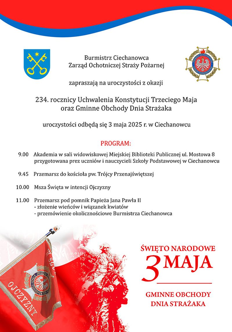 Z okazji 234. rocznicy uchwalenia Konstytucji 3 Maja, Burmistrz Ciechanowca oraz Zarząd Ochotniczej Straży Pożarnej zapraszają mieszkańców miasta i gminy, a także gości, do wzięcia udziału w uroczystościach Narodowego Święta 3 Maja.
