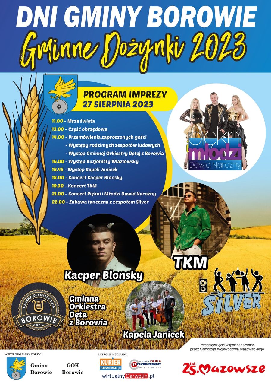 Uroczystości rozpoczną się Eucharystią celebrowaną 27 sierpnia o godzinie 11:00 w kościele parafialnym Świętej Trójcy w Borowiu. Po nabożeństwie będzie część obrzędowa, następnie przemówienia okolicznościowe i występy rodzimych zespołów ludowych, Gminnej Orkiestry Dętej oraz iluzjonisty. Od godziny 16:45 na estradzie królować będzie taniec, śpiew i muzyka w wykonaniu kapeli Janicek, Kacpra Błońskiego, TKM oraz gwiazdy wieczoru - zespołu Piękni i Młodzi. Od 22:00 zabawa taneczna z zespołem Silver.Jak zapewniają organizatorzy, Dni Gminy Borowie połączone z Gminnymi Dożynkami to jedna z największych imprez rozrywkowych integrująca mieszkańców gminy i jeden z najpiękniejszych dni w roku każdego rolnika. To radość i odpoczynek po ciężkiej pracy.