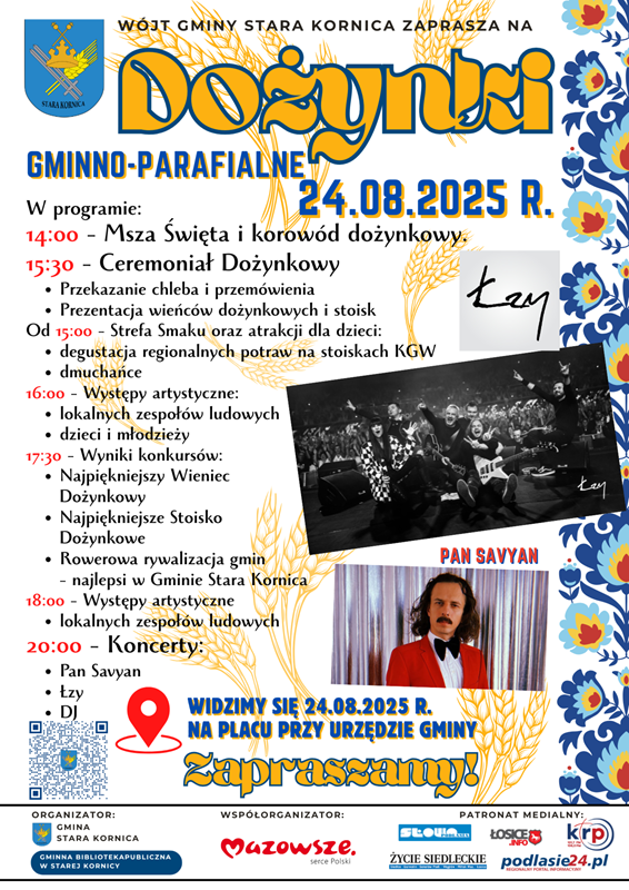 Gmina Stara Kornica zaprasza na tegoroczne dożynki gminno-parafialne, które odbędą się w niedzielę, 24 sierpnia. Uroczystości rozpoczną się o godzinie 14:00 Mszą Świętą w kościele parafialnym, po której ulicami przejdzie tradycyjny korowód dożynkowy. Część oficjalna oraz dalsze wydarzenia będą miały miejsce na placu przy Urzędzie Gminy w Starej Kornicy.