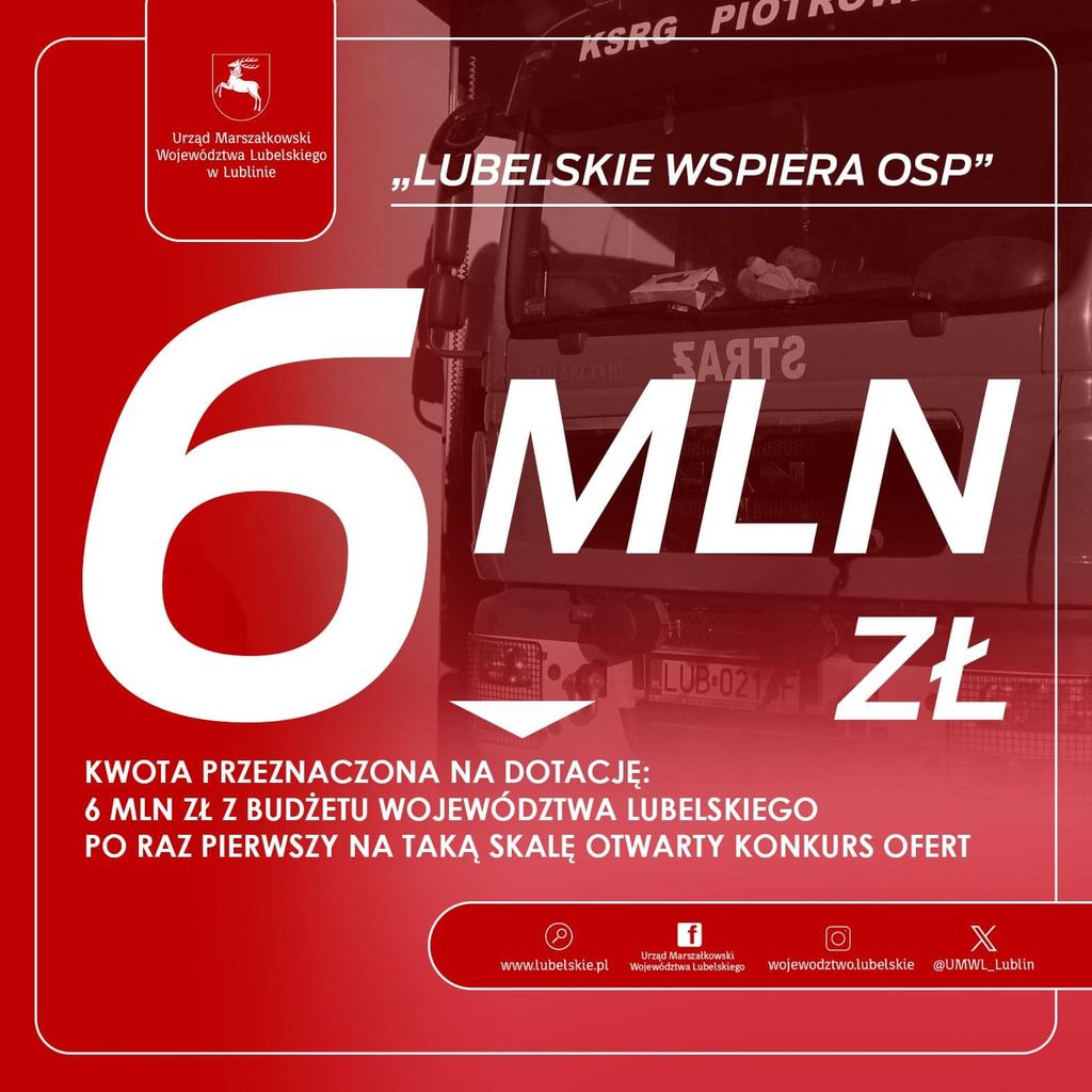 Zarząd Województwa Lubelskiego ogłosił otwarty konkurs na realizację zadania w zakresie bezpieczeństwa publicznego „Lubelskie wspiera OSP”. Do podziału jest sześć milionów złotych. Pieniądze będzie można przeznaczyć na zakup niezbędnego sprzętu służącego ochronie życia, zdrowia, mienia lub środowiska przed pożarem, klęską żywiołową lub innym miejscowym zagrożeniem oraz wyposażenie strażaków ochotników w niezbędny sprzęt ochrony osobistej. Wnioski na konkurs należy składać w terminie do 26 stycznia.Jak informuje nas radny wojewódzki Ryszard Szczygieł spotkanie informacyjne dla jednostek OSP z terenu powiatu łukowskiego, które chciałyby złożyć wnioski, odbędzie się we wtorek 16 stycznia o godzinie 15.00 w sali konferencyjnej im. Jana Pawła II w budynku Urzędu Miasta i Starostwa Powiatowego.