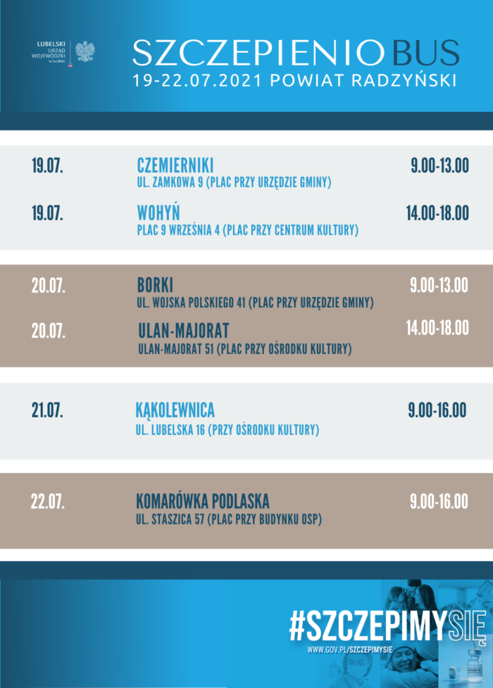 W poniedziałek, 19 lipca mobilny punkt szczepień pojawi się przed Urzędem Gminy w Czemiernikach. Będzie tam od 9:00 do 13:00. Potem przeniesie się do Wohynia, będzie dostępny na placu przed Gminnym Centrum Kultury między 14:00 a 18:00. We wtorek, 20 lipca między 9:00 a 13:00 będzie się można szczepić w Borkach, a między 14:00 a 19:00 w Ulanie. W środę, 21 lipca od 9:00 do 16:00 szczepienia będą prowadzone w Kąkolewnicy, a w czwartek, 22 lipca od 9:00 do 16:00 w Komarówce.