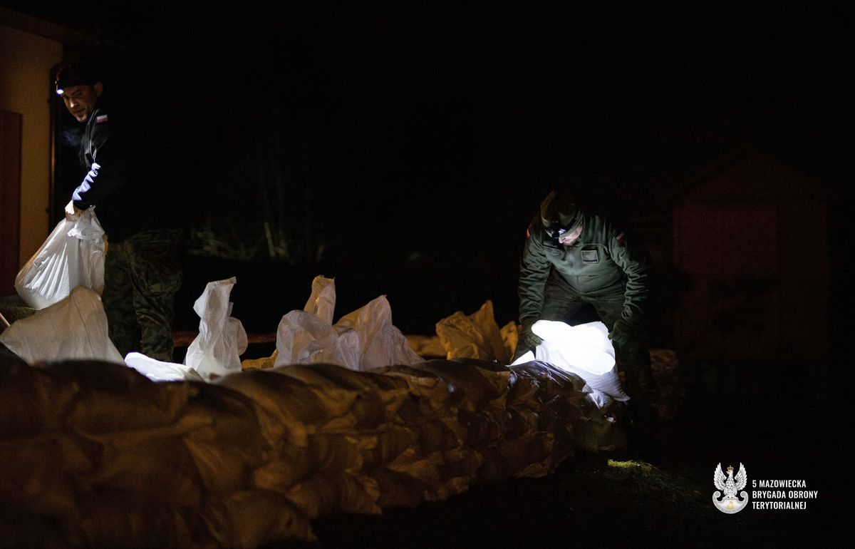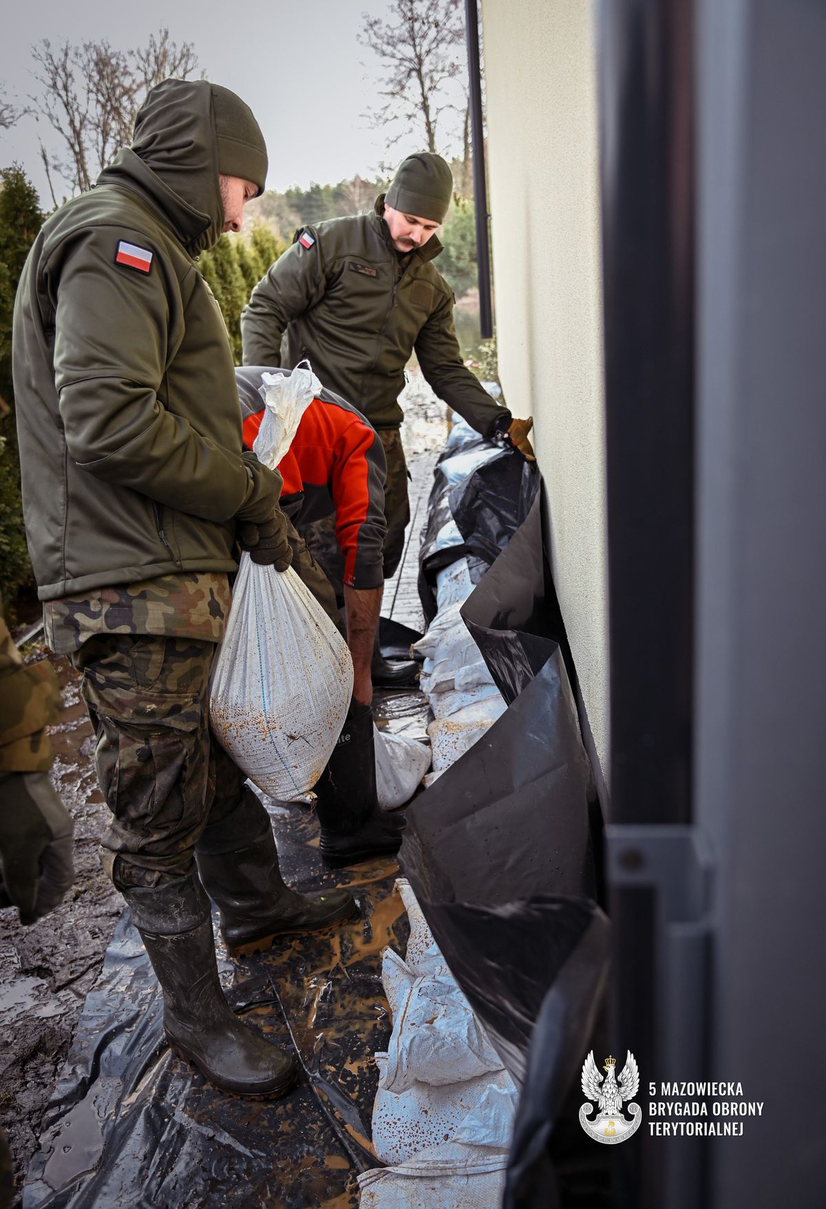 5 Mazowiecka Brygada Obrony Terytorialnej przy współpracy z Państwową Strażą Pożarną w Wyszkowie realizuje działania w ramach zarządzania kryzysowego, mające na celu przeciwdziałanie skutkom powodzi na terenie północnego Mazowsza, w okolicach Wyszkowa.