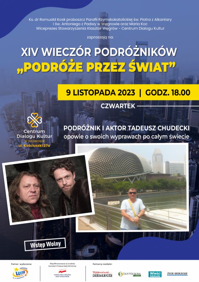 Tadeusz Chudecki debiutował na przełomie lat 70. i 80. i od tamtej pory nieprzerwanie gra w produkcjach teatralnych, filmowych i telewizyjnych (w tym tak znanych jak C.K. Dezerterzy, Miasto 44 czy Polityka). Z zamiłowania jest podróżnikiem – odwiedził 140 krajów na wszystkich kontynentach, w czym pomaga mu znajomość ośmiu języków obcych. Swoją prezentację i barwną opowieść przedstawi węgrowskiej publiczności w sali „Wirydarz” CDK w czwartek o godzinie 18.00.