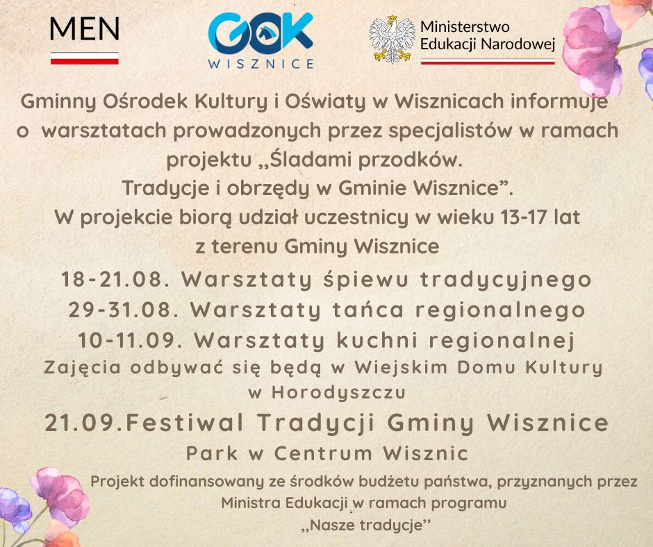 Na zakończenie działań projektowych zaplanowano Festiwal Tradycji Gminy Wisznice, który odbędzie się 21 września w Parku w Centrum Wisznic.