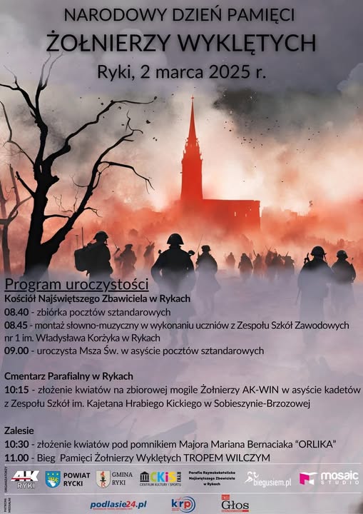 Obchody rozpoczną się o godzinie zbiórką pocztów sztandarowych przy Kościele Najświętszego Zbawiciela w Rykach. O godzinie 08:45 zaplanowano montaż słowno-muzyczny w wykonaniu uczniów Zespołu Szkół Zawodowych nr 1 im. Władysława Korżyka w Rykach. Potem odbędzie się Msza święta i złożenie kwiatów na zbiorowej mogile Żołnierzy AK-WIN, z asystą kadetów z Zespołu Szkół im. Kajetana Hrabiego Kickiego w Sobieszynie - Brzozowej na Cmentarzu Parafialnym w Rykach, Następnie uczestnicy uroczystości udadzą się do Zalesia, by złożyć hołd pod pomnikiem Majora Mariana Bernaciaka „Orlika”.Kulminacyjnym punktem dnia będzie Bieg Pamięci Żołnierzy Wyklętych TROPEM WILCZYM, który rozpocznie się o godzinie 11:00. Wydarzenie to nie tylko upamiętnia, ale również pozwala uczestnikom aktywnie włączyć się w pielęgnowanie pamięci o bohaterach.
