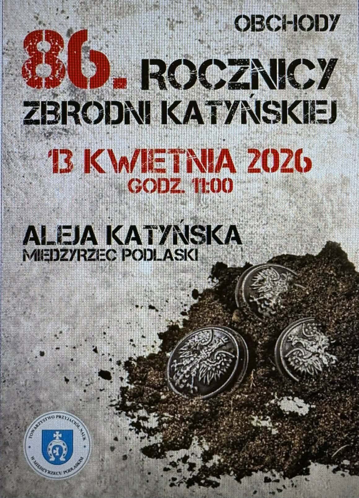 Towarzystwo Przyjaciół Nauk w Międzyrzecu Podlaskim zaprasza na uroczystości związane z 86. rocznicą Zbrodni Katyńskiej, które odbędą się w poniedziałek, 13 kwietnia o godzinie 11:00 na Alei Katyńskiej w Międzyrzecu Podlaskim.