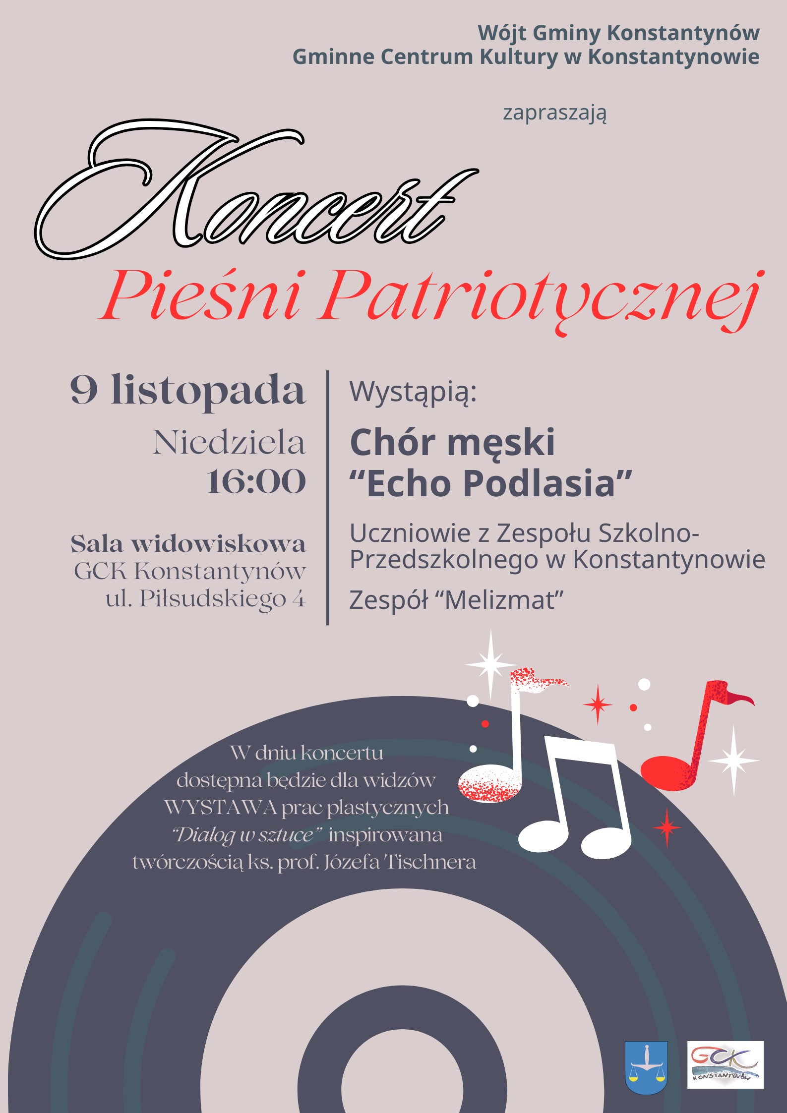 W Konstantynowie świętowanie rozpocznie się 9 listopada o godz. 16:00 w Gminnym Centrum Kultury. Podczas Koncertu Pieśni Patriotycznej wystąpią: chór męski „Echo Podlasia”, uczniowie miejscowej szkoły oraz zespół „Melizmat”. Tego dnia dostępna będzie także wystawa prac plastycznych „Dialog w sztuce”, inspirowana myślą ks. prof. Józefa Tischnera.