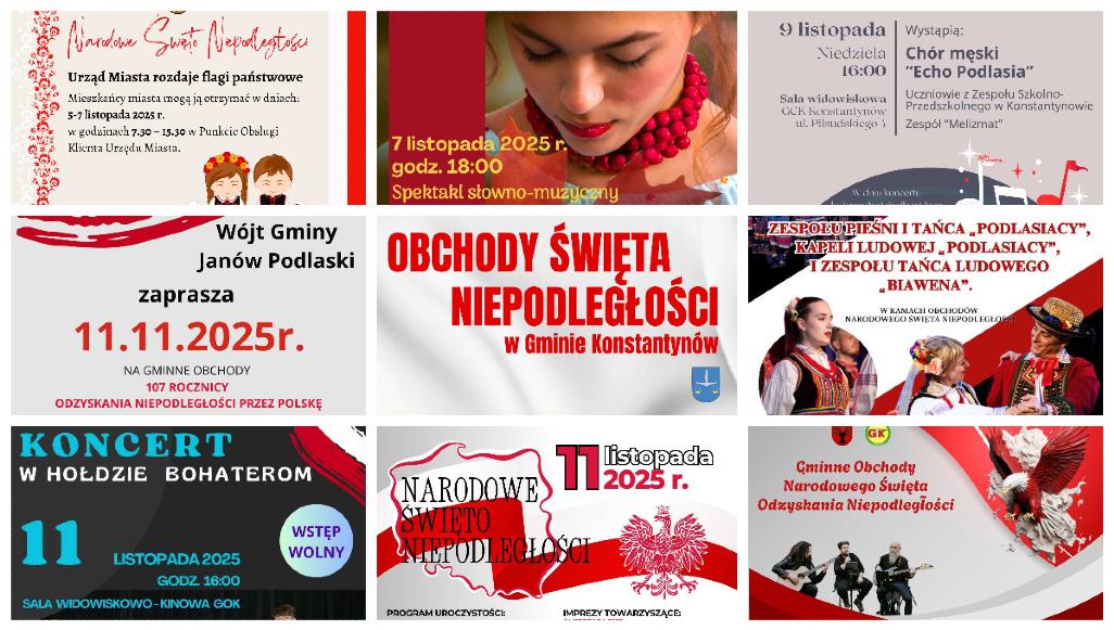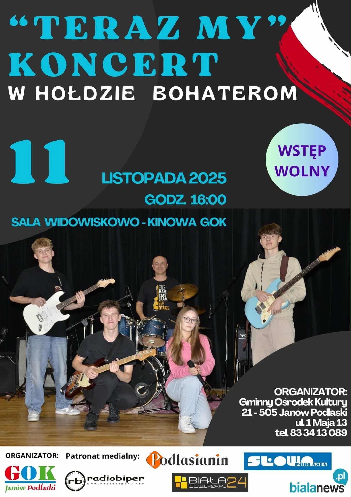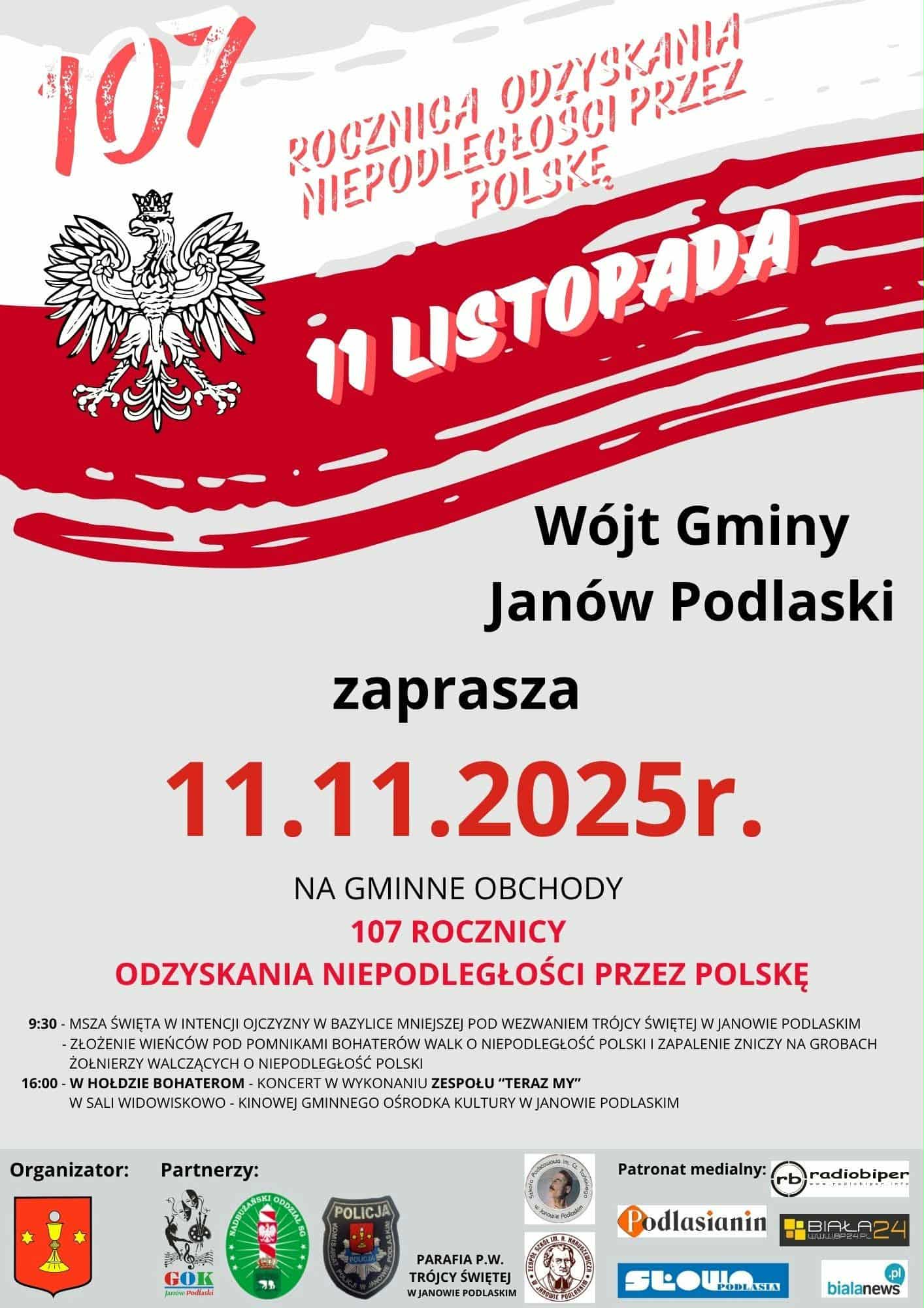 W Janowie Podlaskim obchody rozpoczną się 11 listopada o godz. 9:30 mszą świętą w bazylice mniejszej pw. Trójcy Świętej. Po nabożeństwie delegacje złożą wieńce pod pomnikami bohaterów walk o niepodległość Polski oraz na grobach żołnierzy walczących o wolność. O godz. 16:00 w sali widowiskowo-kinowej Gminnego Ośrodka Kultury odbędzie się koncert „Teraz My – w hołdzie bohaterom”, przygotowany przez młodych muzyków z zespołu „Teraz My”. To wydarzenie, w którym historia i młodość spotykają się na jednej scenie – z szacunkiem, energią i pasją.