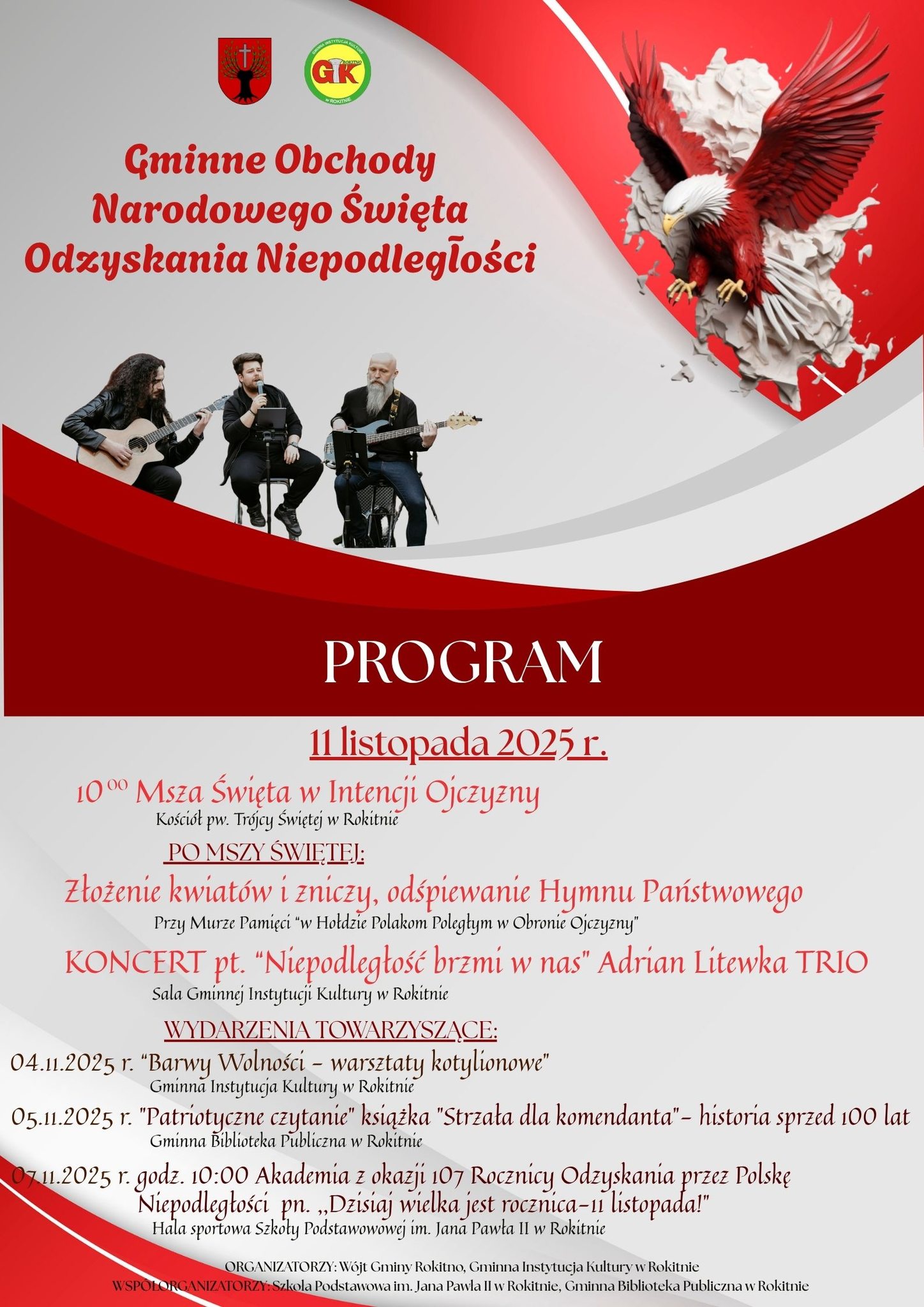 W Rokitnie uroczystości rozpoczną się 11 listopada o godz. 10:00 mszą świętą w kościele pw. Trójcy Świętej. Po niej uczestnicy złożą kwiaty i znicze przy Murze Pamięci „W hołdzie Polakom poległym w obronie Ojczyzny”. O godz. 11:00 w sali Gminnej Instytucji Kultury odbędzie się koncert „Niepodległość brzmi w nas” w wykonaniu Adrian Litewka Trio. To spotkanie z muzyką, która nie tylko wzrusza, ale i łączy – bo brzmienie niepodległości to dźwięk wspólnoty.