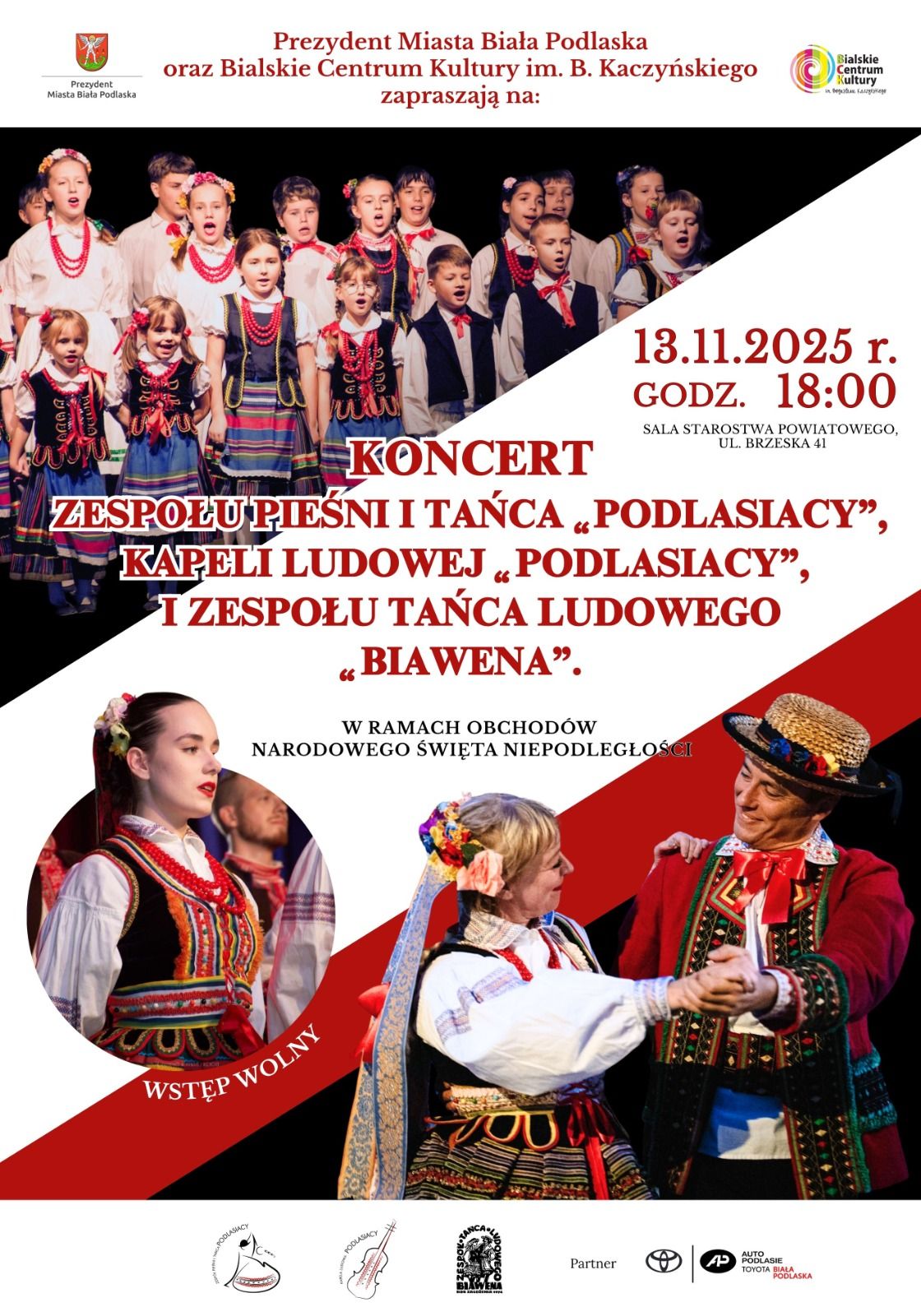 W czwartek, 13 listopada o godz. 18:00, w sali Starostwa Powiatowego przy ul. Brzeskiej 41 zabrzmi koncert „Dla Niepodległej” w wykonaniu Zespołu Pieśni i Tańca „Podlasiacy”, Kapeli Ludowej „Podlasiacy” oraz Zespołu Tańca Ludowego „Biawena”.