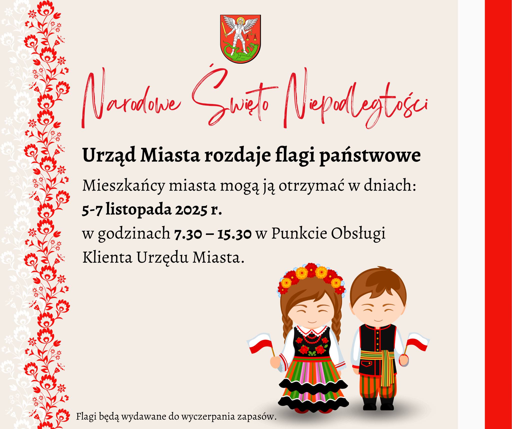 Biała Podlaska – od flag po koncertyOd 5 do 7 listopada mieszkańcy miasta mogą odebrać w Urzędzie Miasta flagi państwowe. Będą one rozdawane w Punkcie Obsługi Klienta w godzinach 7:30–15:30, do wyczerpania zapasów.
